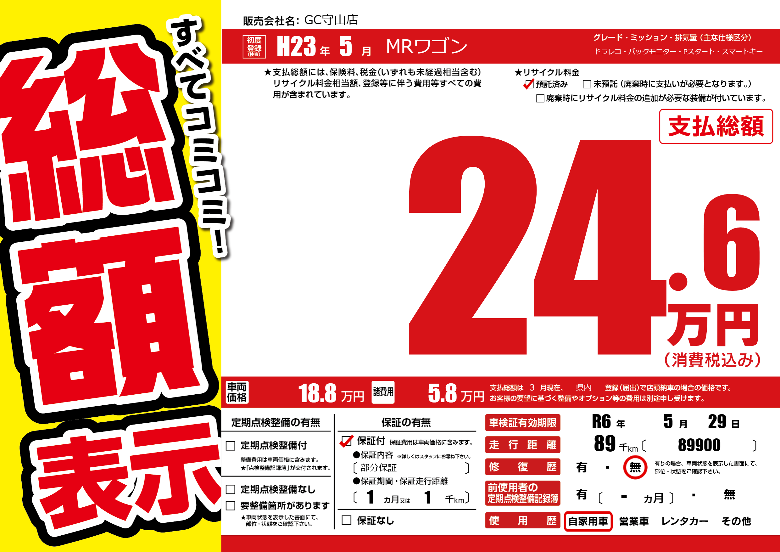 | 車名 | MRワゴン | グレード ミッション 排気量 |