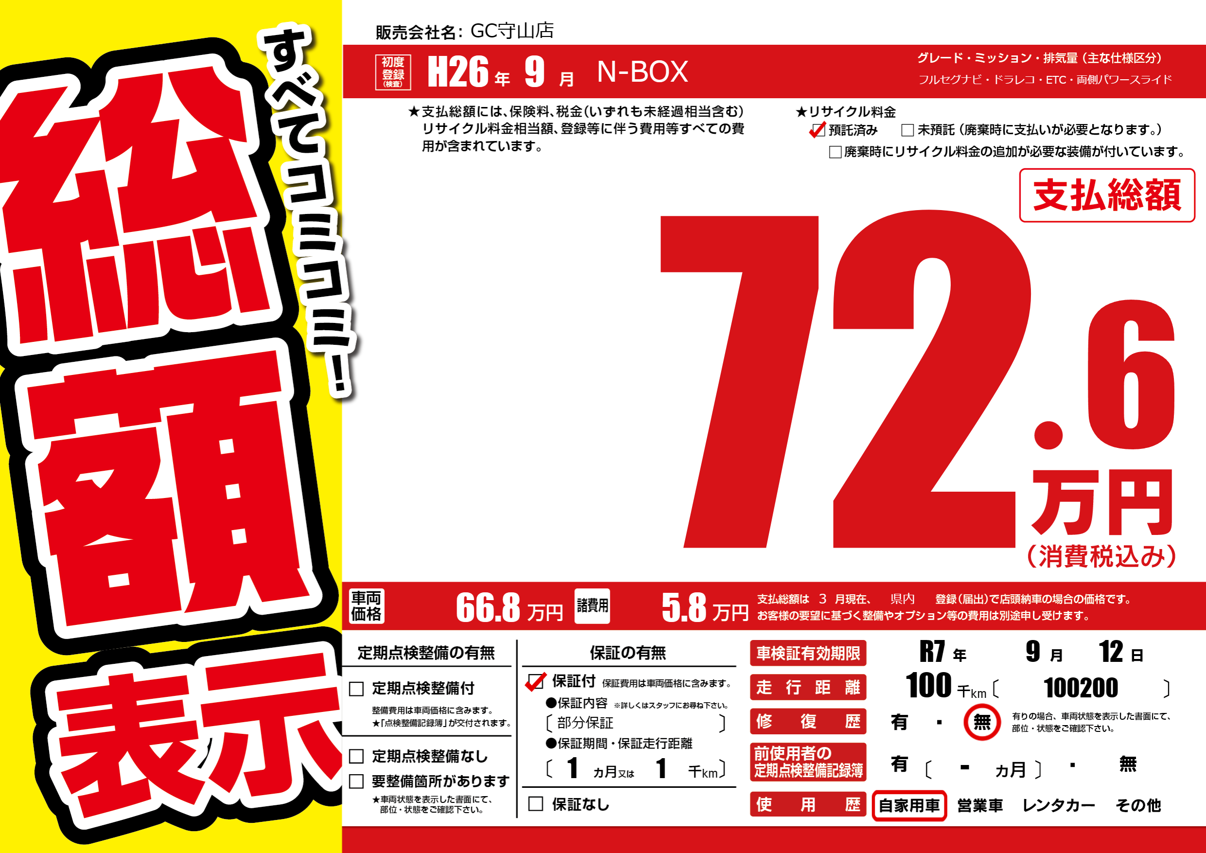 | 車名 | N-BOX | グレード ミッション 排気量 |