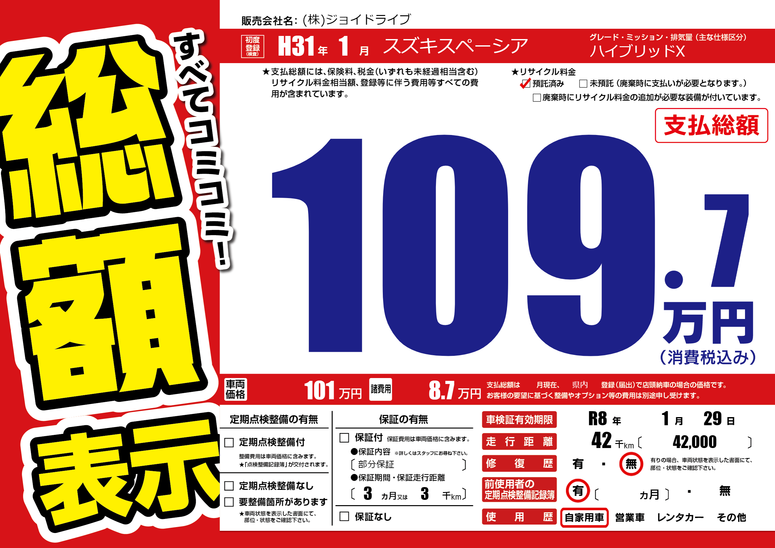 | 走行キロ | 4.2万km | 初年度登録 | H31年1月 |