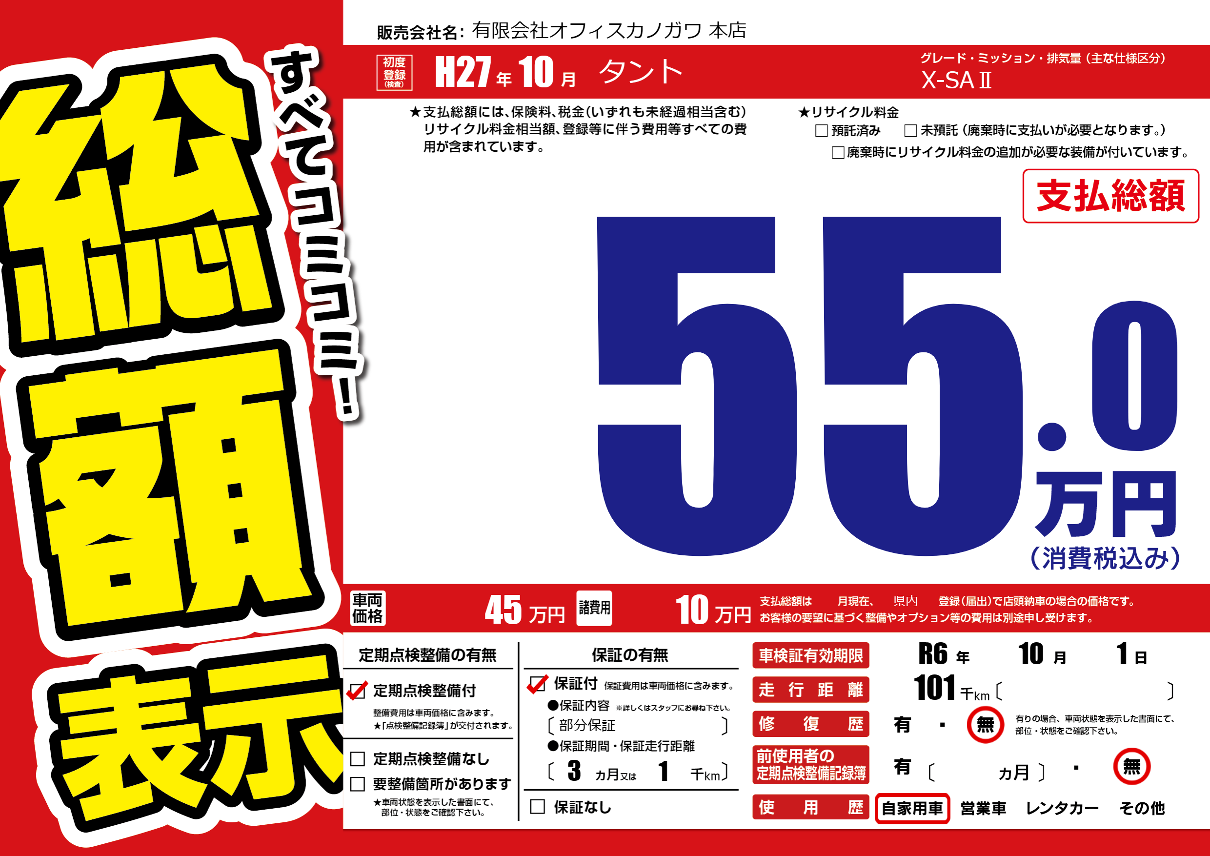 | 走行キロ | 10.1万km | 初年度登録 | H27年10月 |