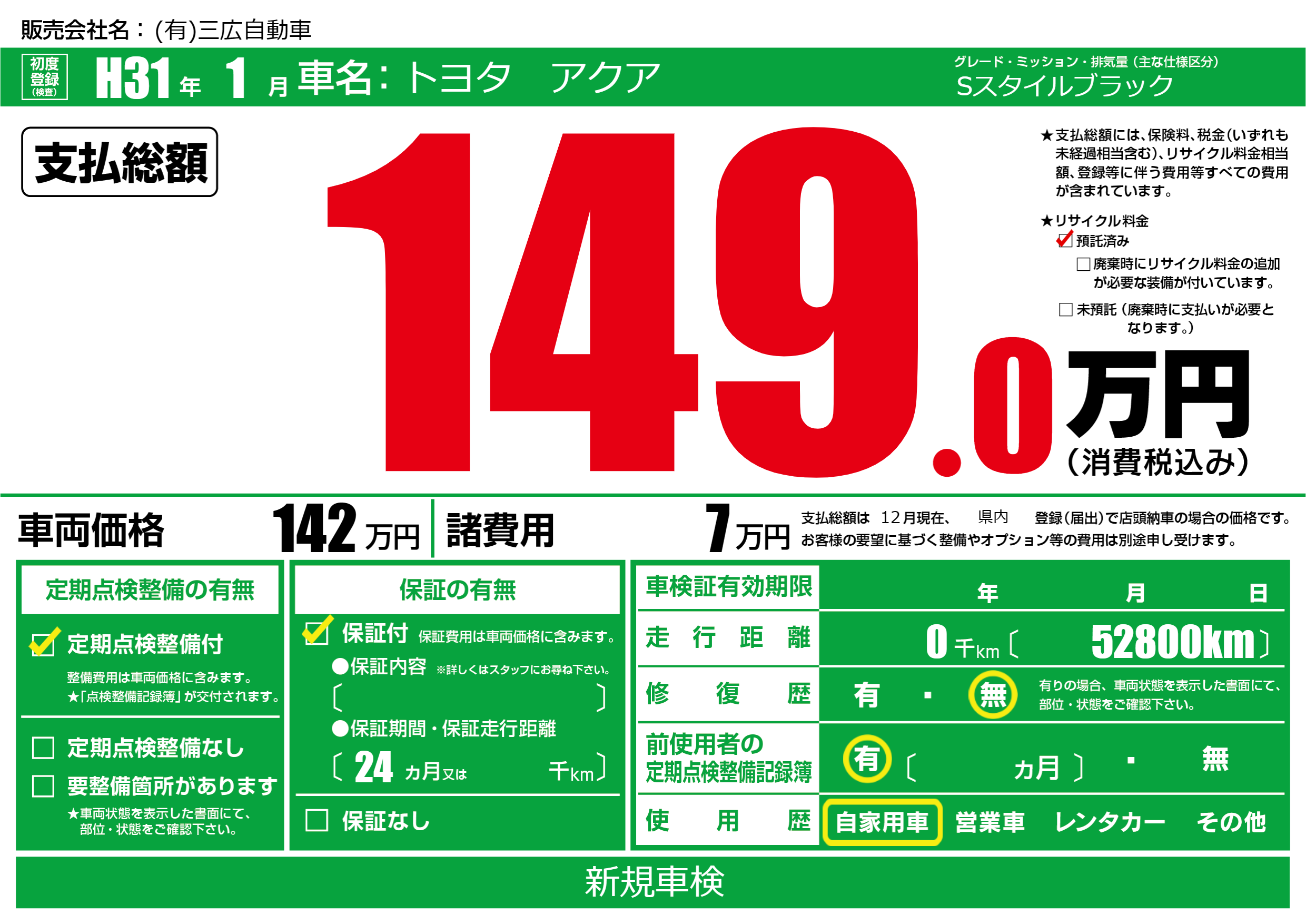 | 車名 | トヨタ アクア | グレード ミッション 排気量 |