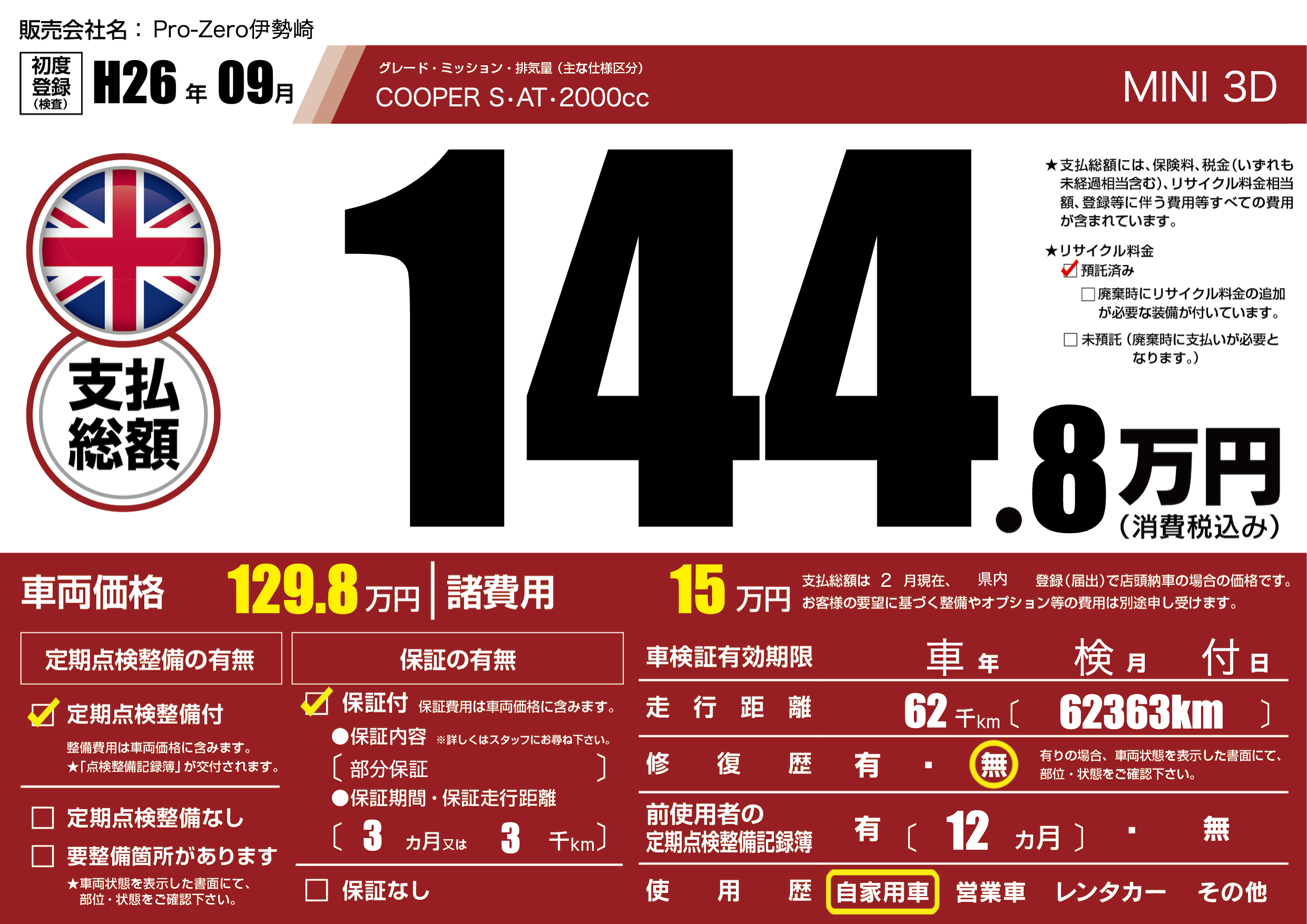 | 車名 | MINI 3D | グレード ミッション 排気量 |