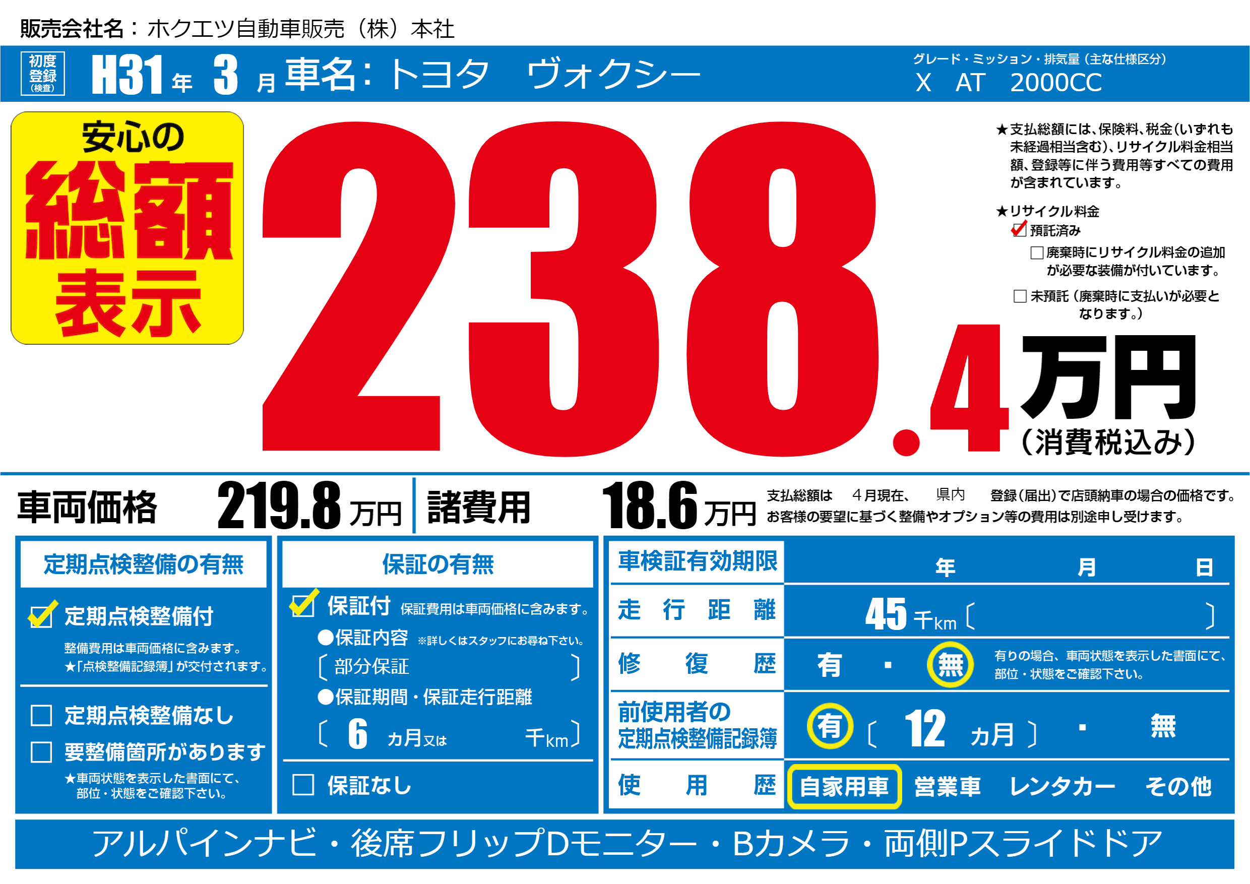 | 走行キロ | 4.5万km | 初年度登録 | H31年3月 |