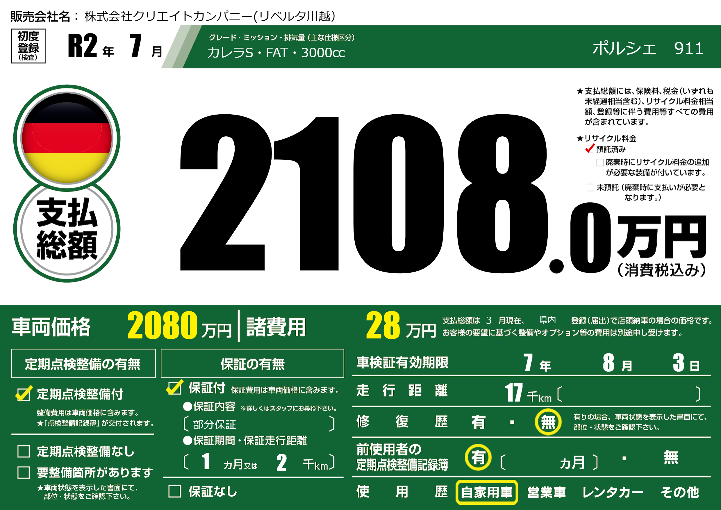 | 車名 | ポルシェ 911 | グレード ミッション 排気量 |