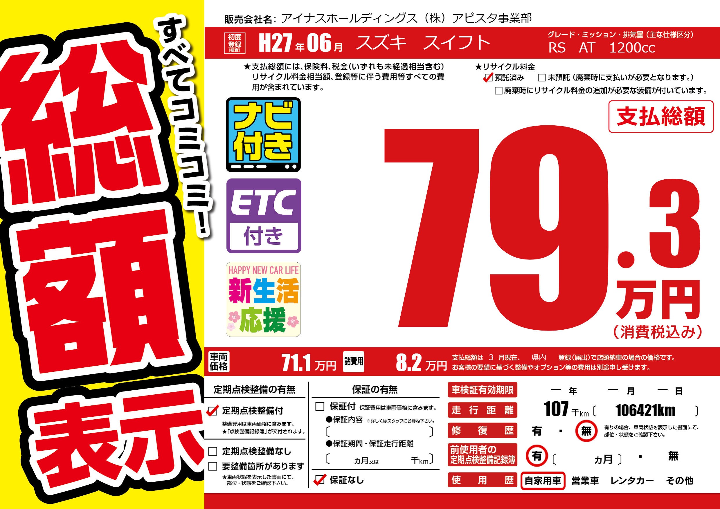 | 走行キロ | 10.7万km | 初年度登録 | H27年06月 |