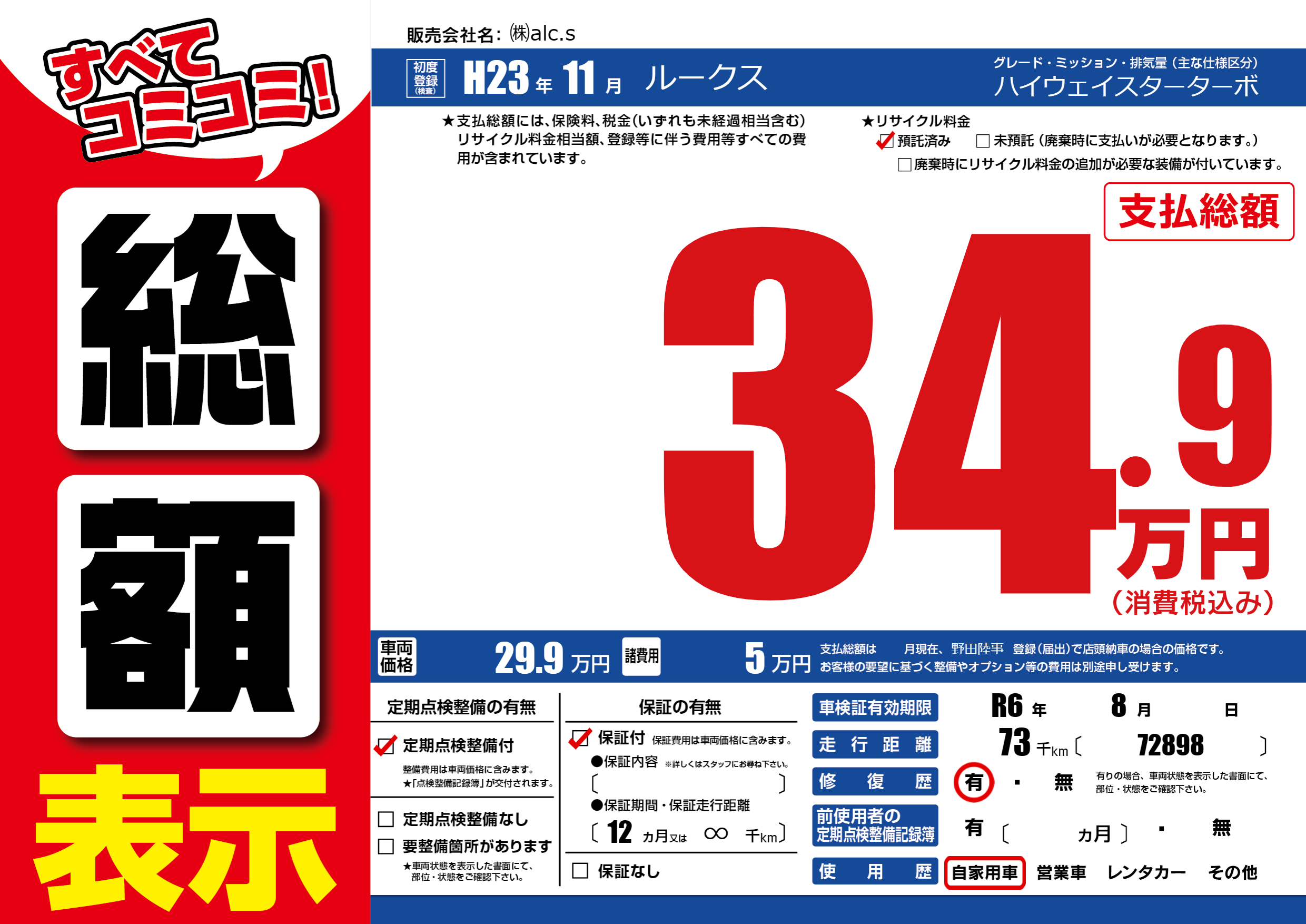 | 車検制限 | R6年 8月 - 日 | ||