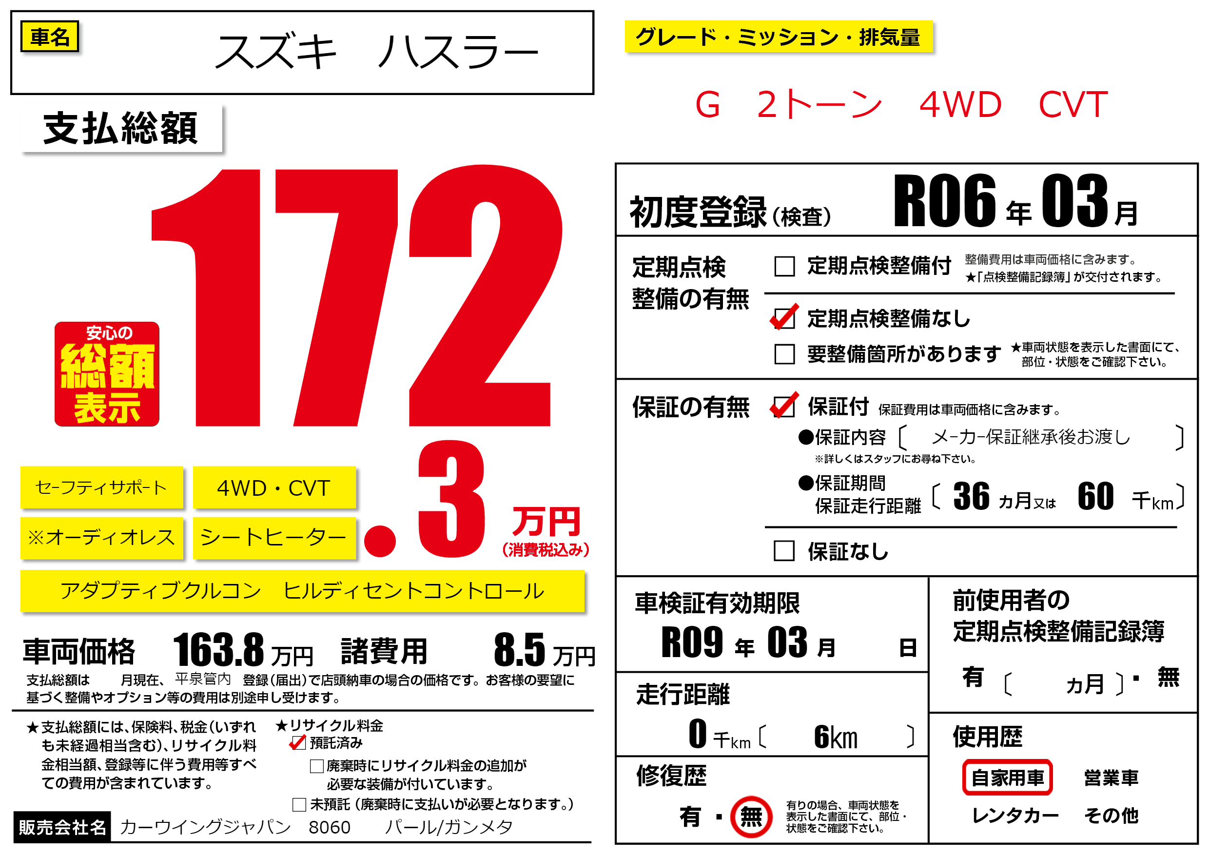 | 車名 | スズキ ハスラー | グレード ミッション 排気量 |