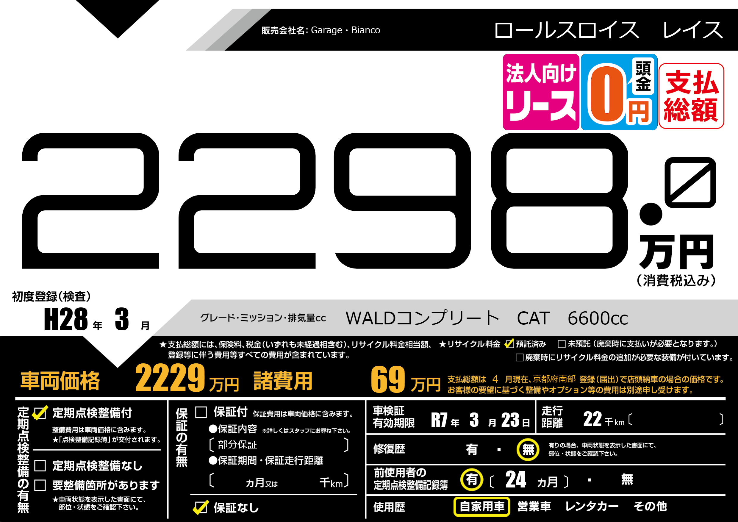 | 車名 | ロールスロイス レイス | グレード ミッション 排気量 |