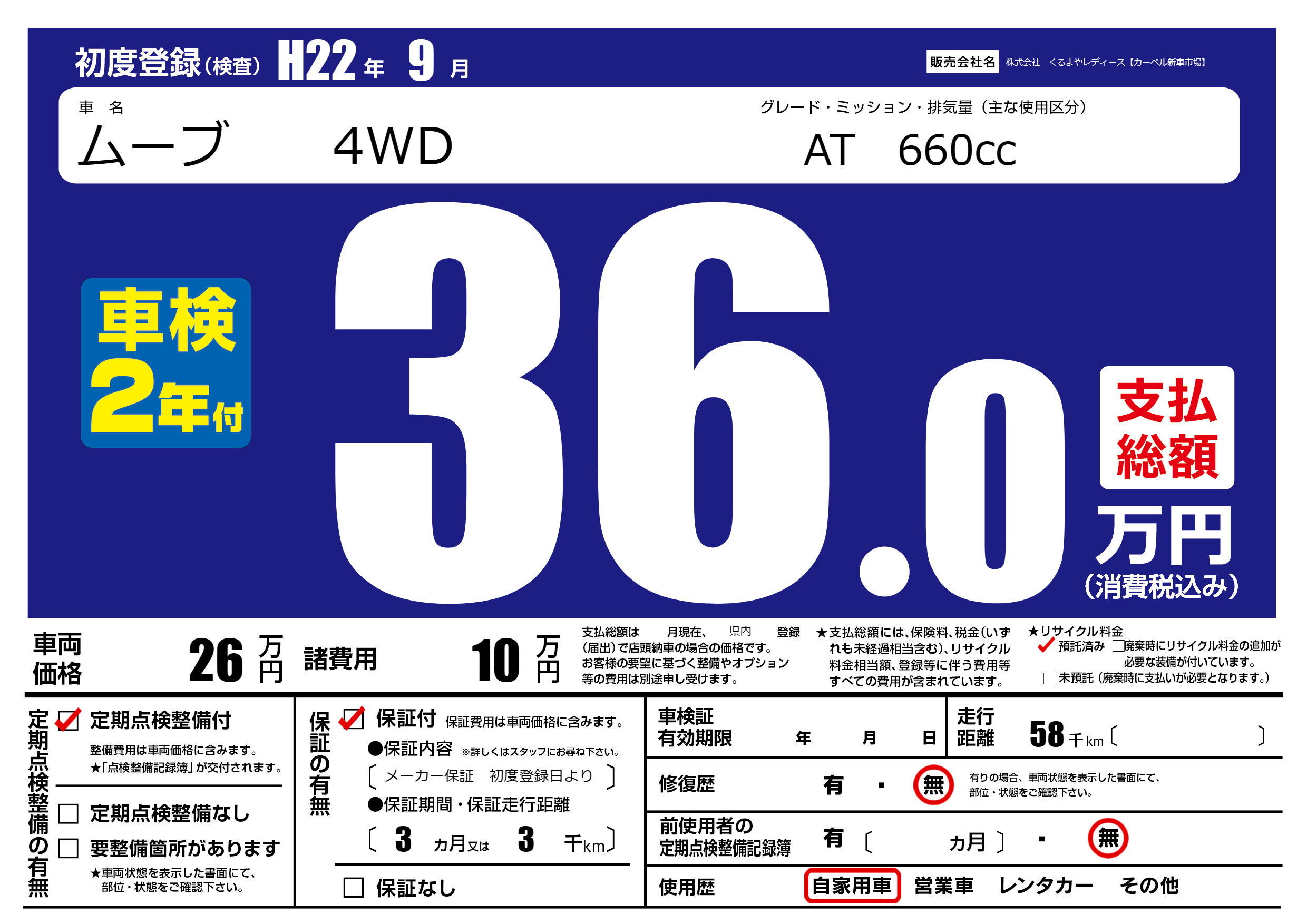| 走行キロ | 5.8万km | 初年度登録 | H22年9月 |