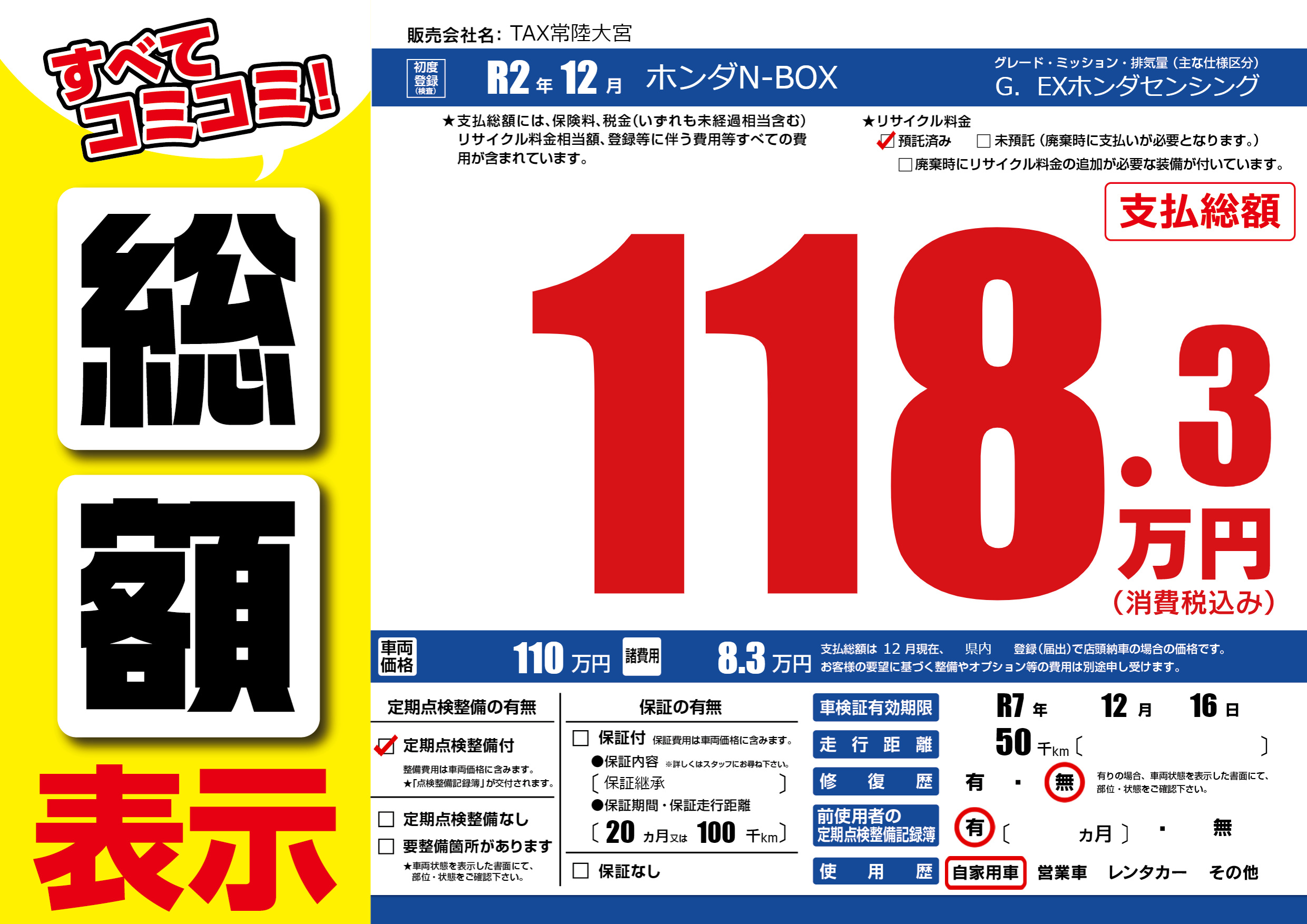 | 車名 | ホンダN-BOX | グレード ミッション 排気量 |