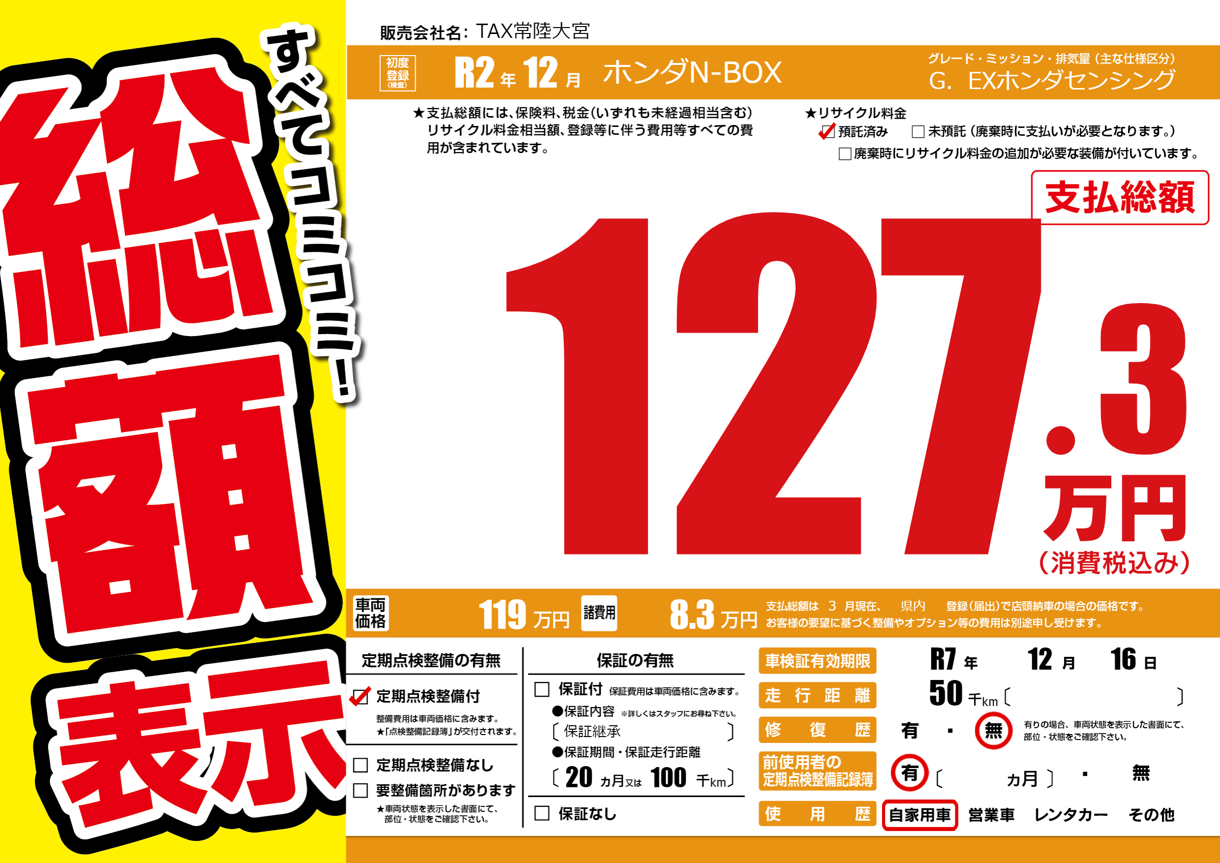 | 走行キロ | 5万km | 初年度登録 | R2年12月 |