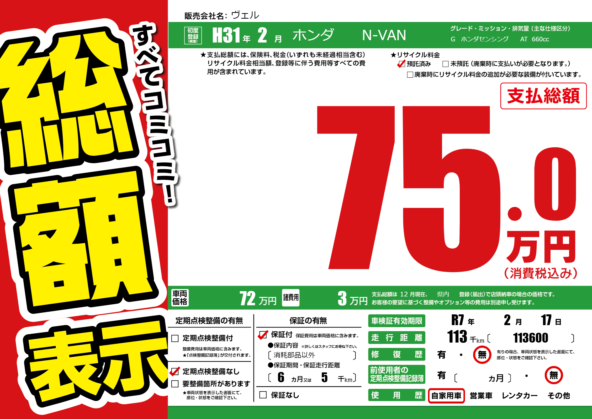 なし | 車検制限 | R7年2月17月 |