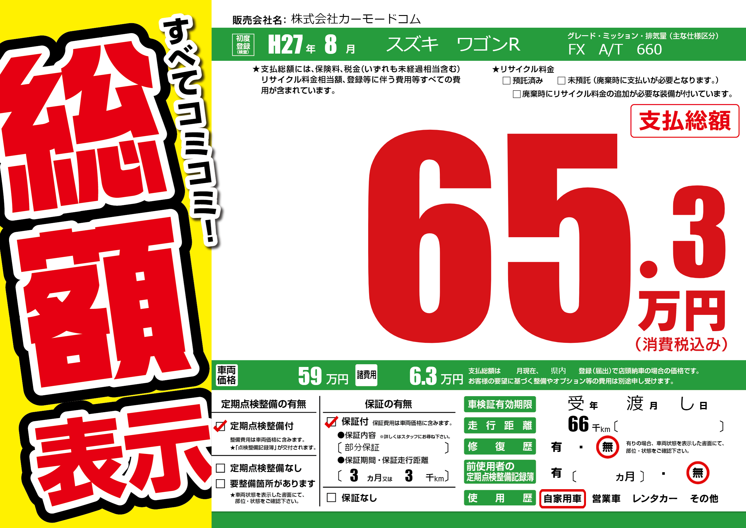 | 車名 | スズキ ワゴンR | グレード ミッション 排気量 |