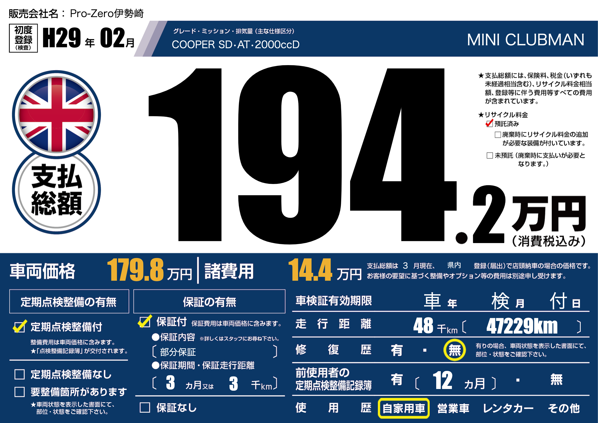 | 車名 | MINI CLUBMAN | グレード ミッション 排気量 |