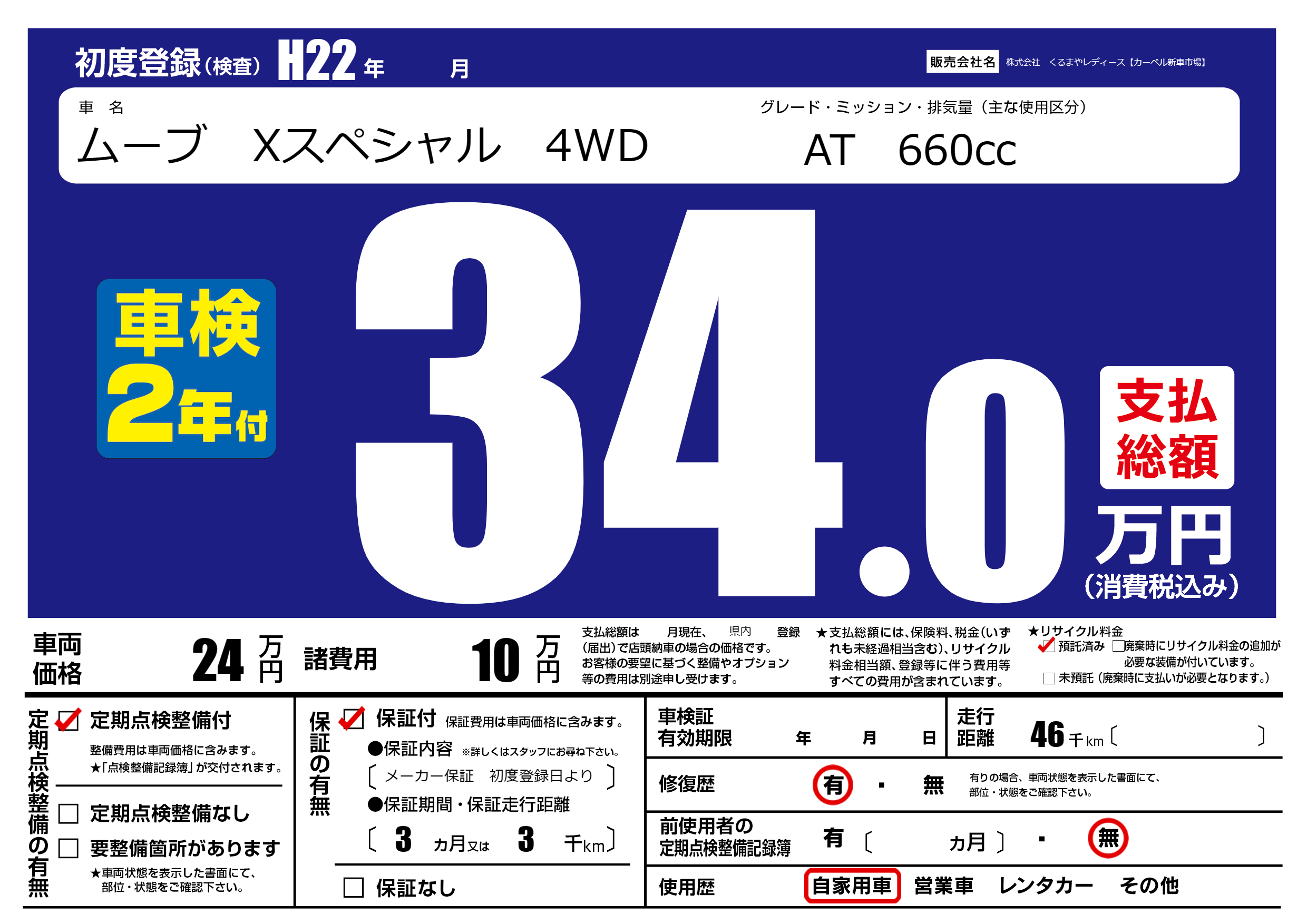 | 車名 | ムーブ Xスペシャル 4WD | グレード ミッション 排気量 |