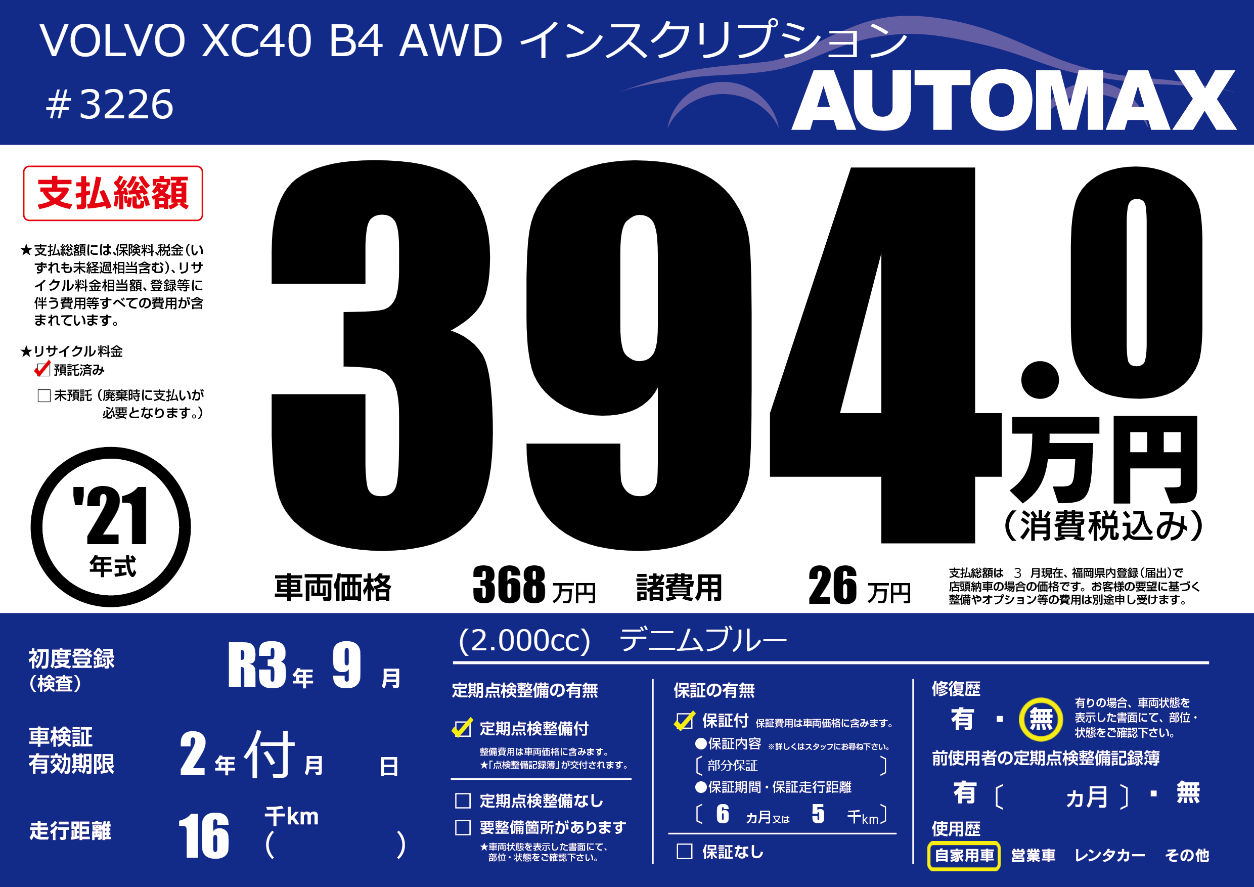 | 車名 | VOLVO XC40 B4 AWD インスクリプション | グレード ミッション 排気量 |