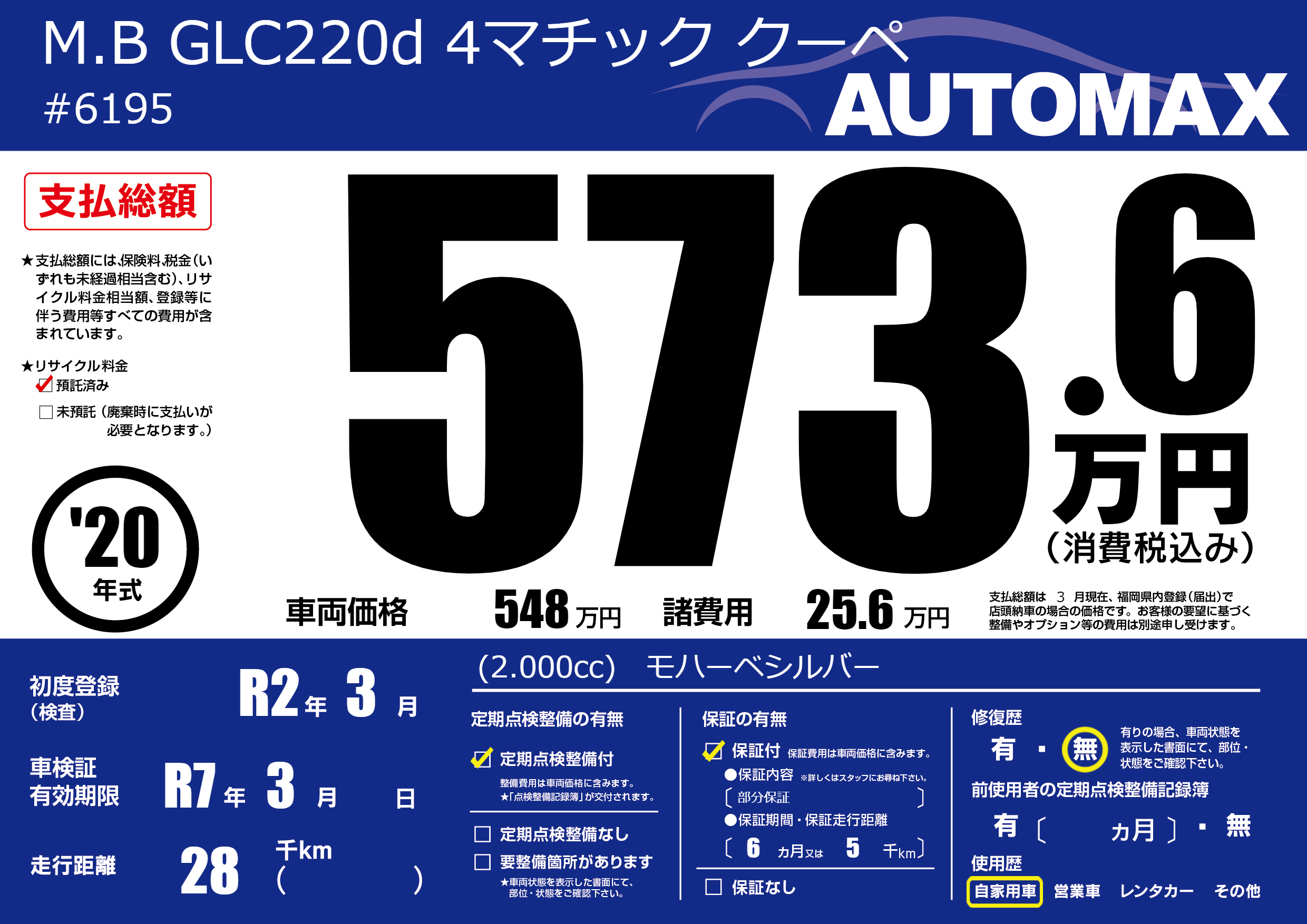 | 車名 | M.B GLC220d 4マチック クーペ | グレード ミッション 排気量 |