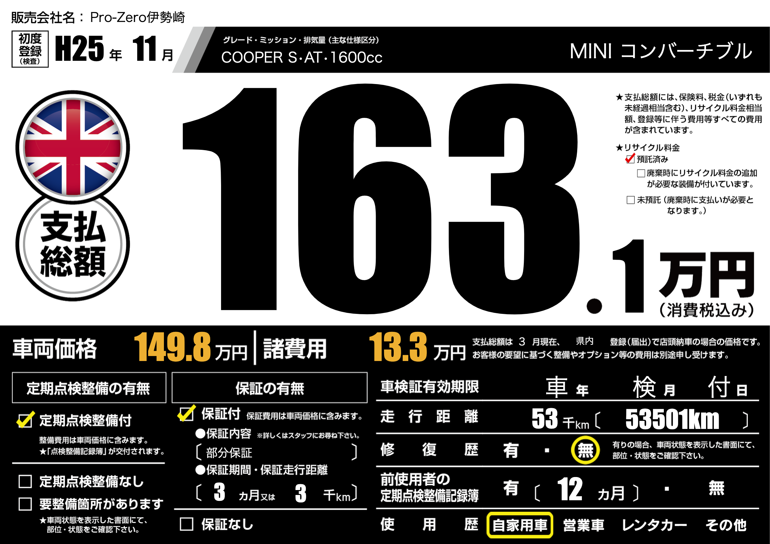 | 車名 | MINI コンバーチブル | グレード ミッション 排気量 |