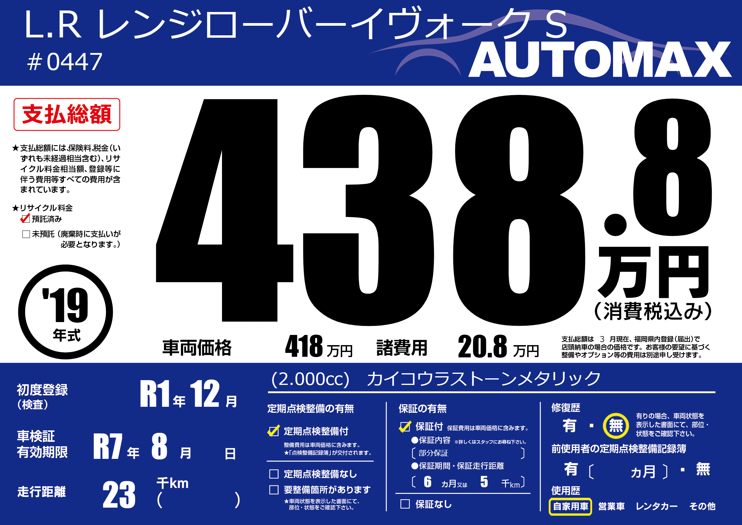 | 車名 | L.R レンジローバーイヴォーク S | グレード ミッション 排気量 |