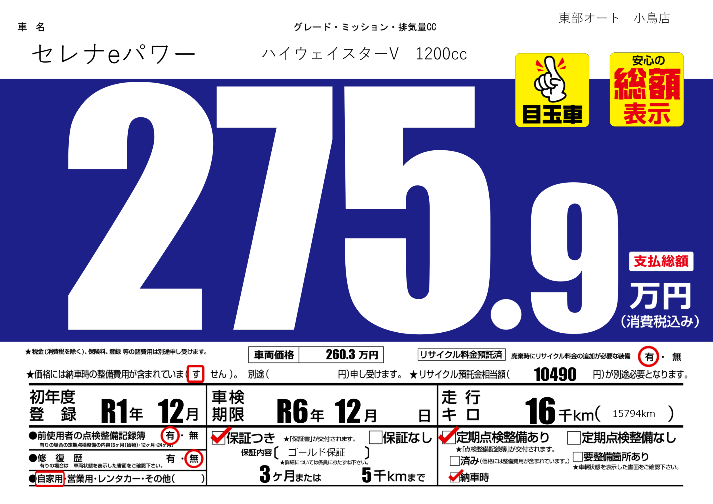 | 定期点検整備 | 定期点検整備あり 納車時あり | ||