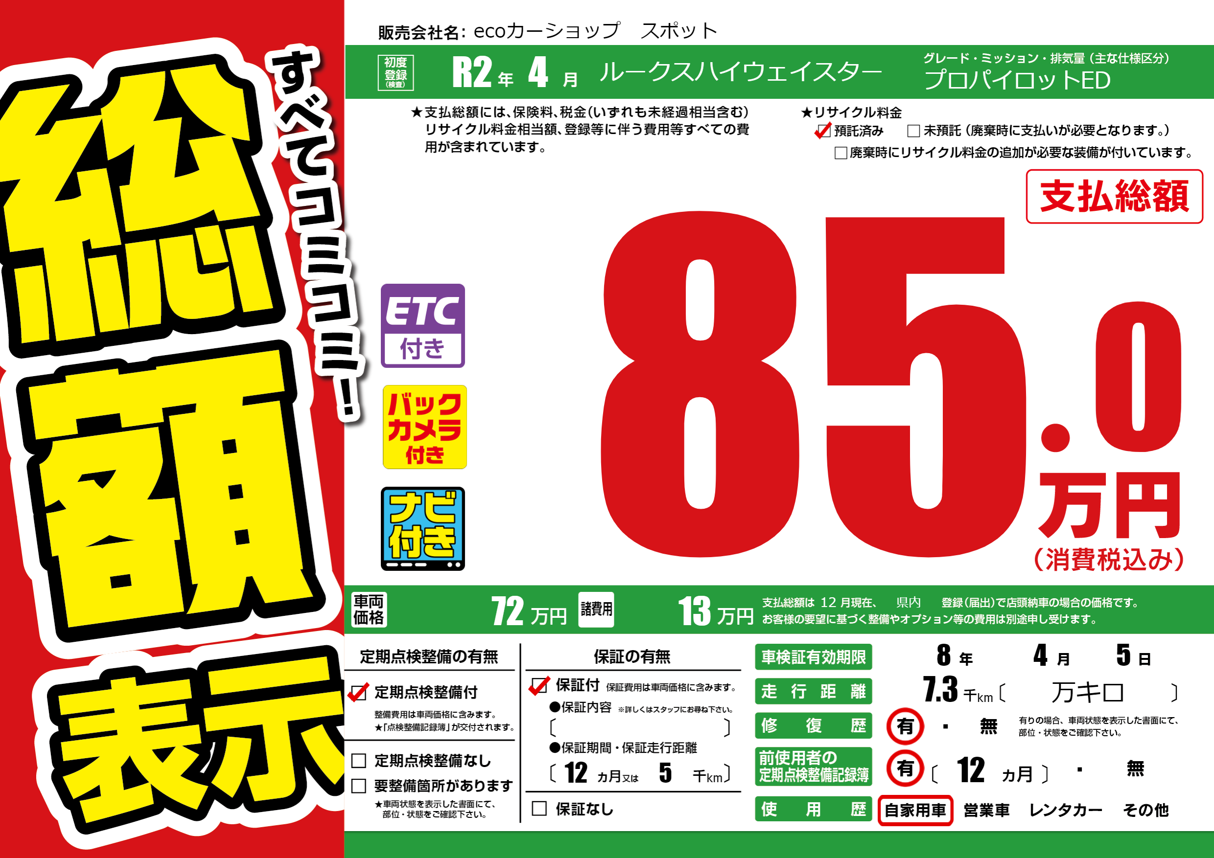 | 走行キロ | 0.7万km | 初年度登録 | R2年4月 |
