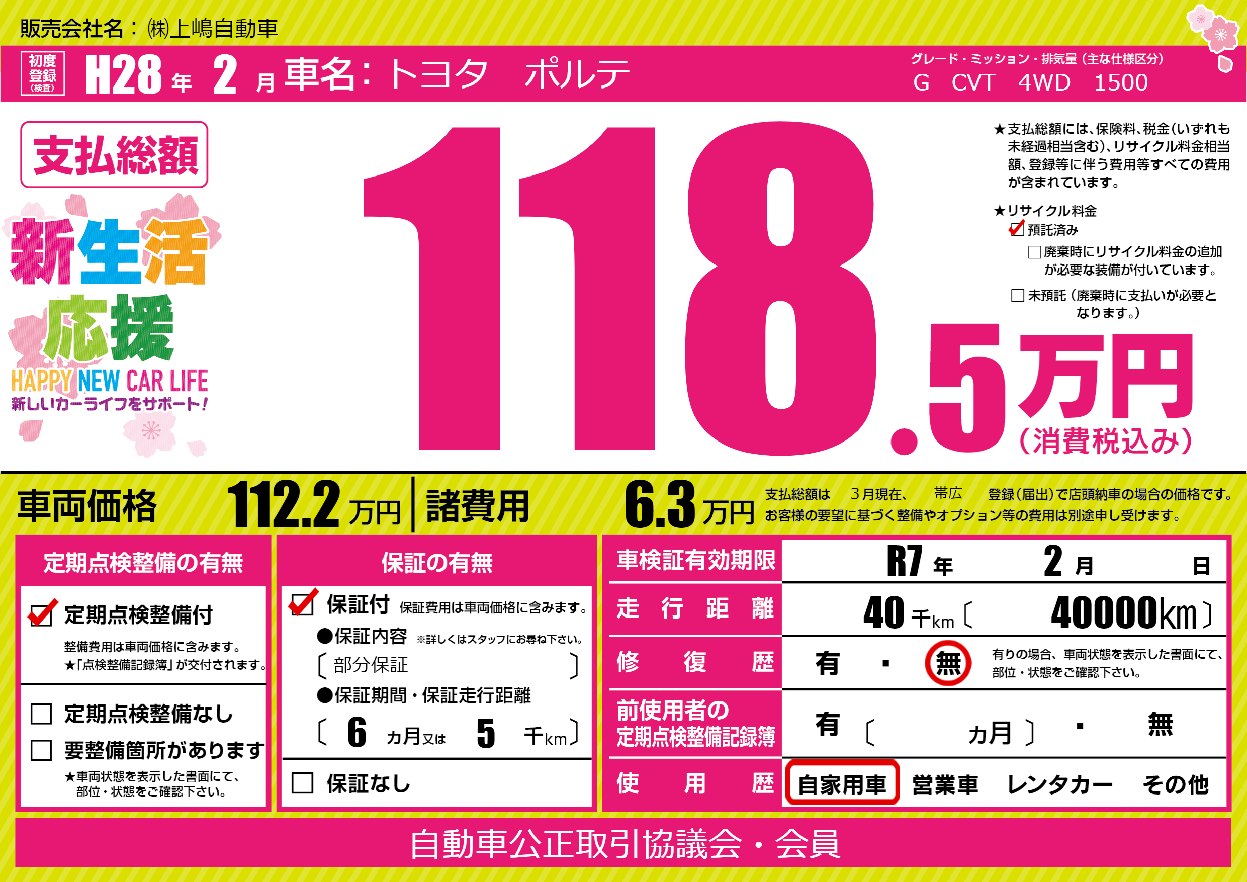 | 車名 | トヨタ ポルテ | グレード ミッション 排気量 |