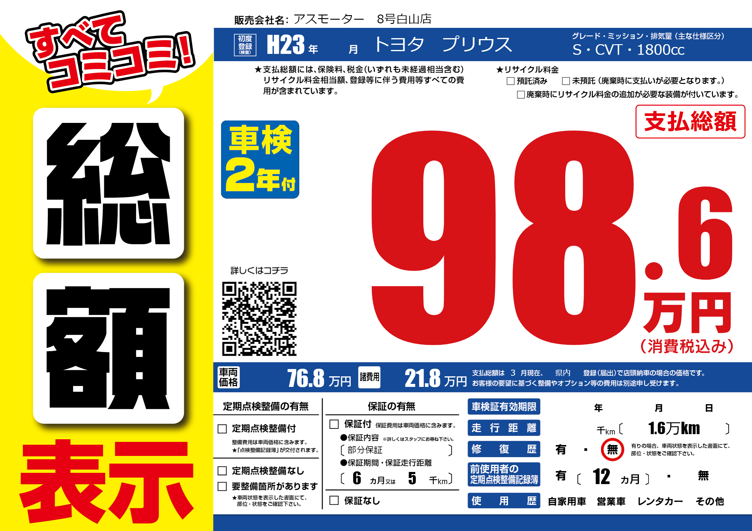 | 車名 | トヨタ プリウス | グレード ミッション 排気量 |