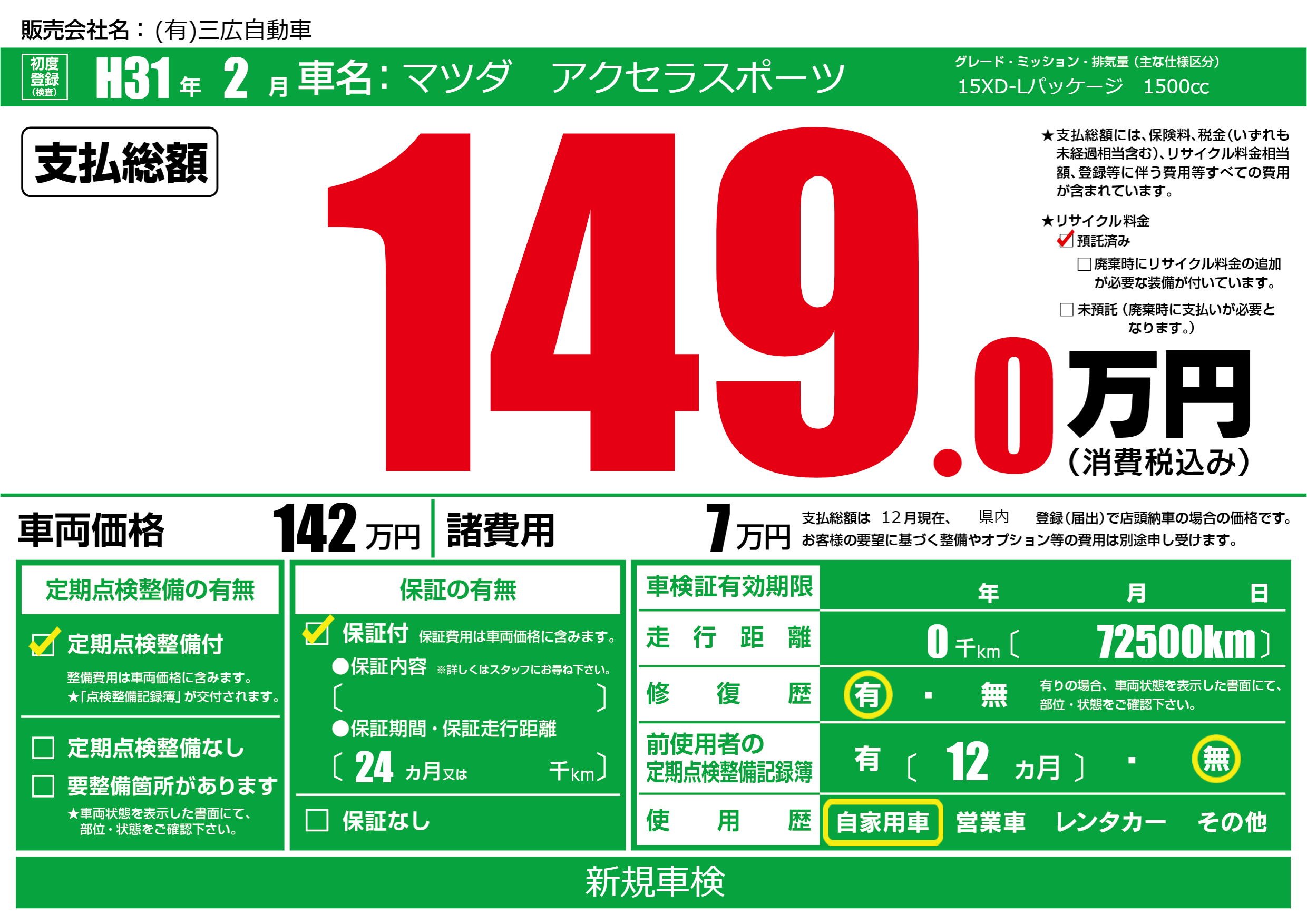| 車名 | マツダ アクセラスポーツ | グレード ミッション 排気量 |