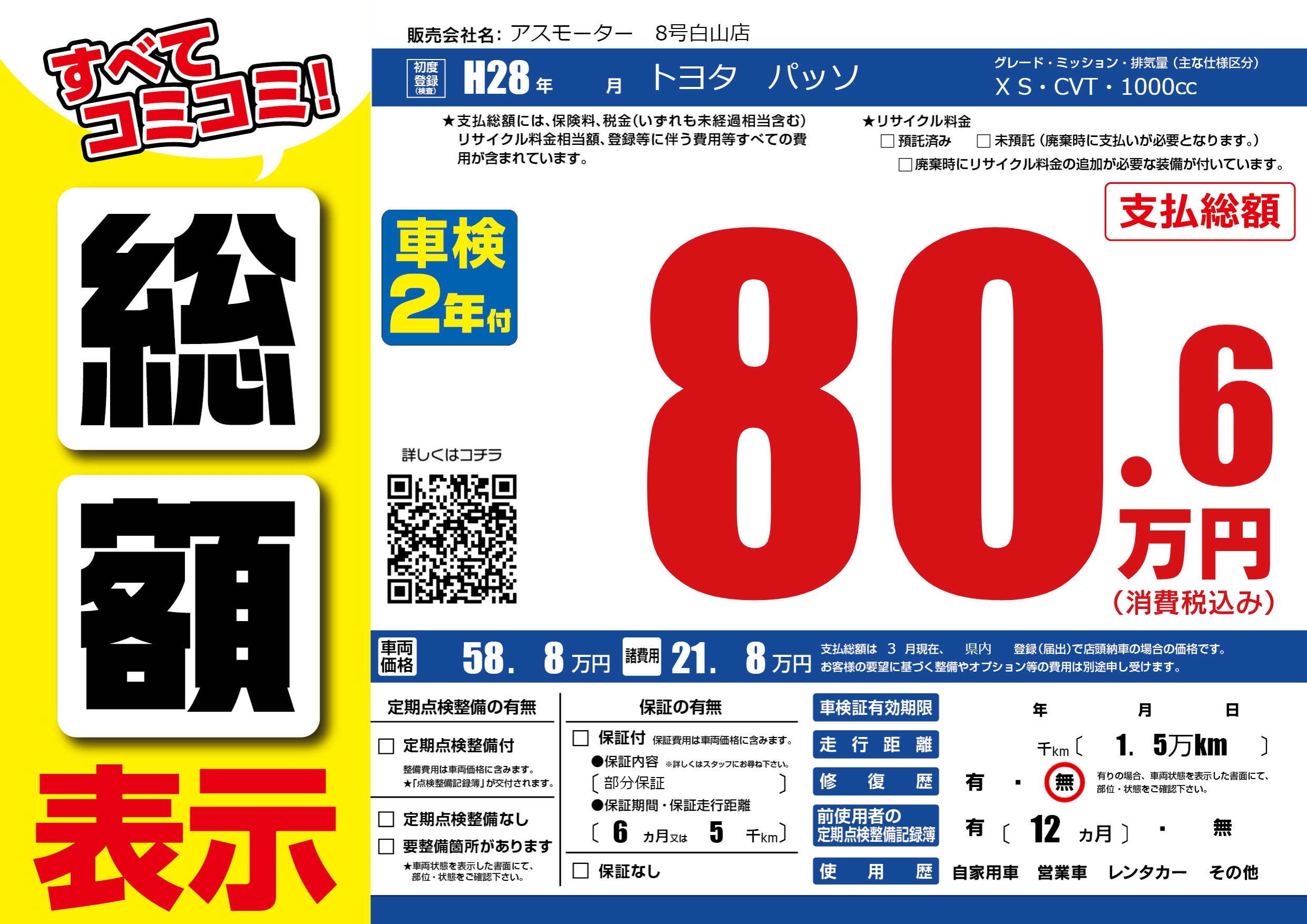 | 車名 | トヨタ パッソ | グレード ミッション 排気量 |
