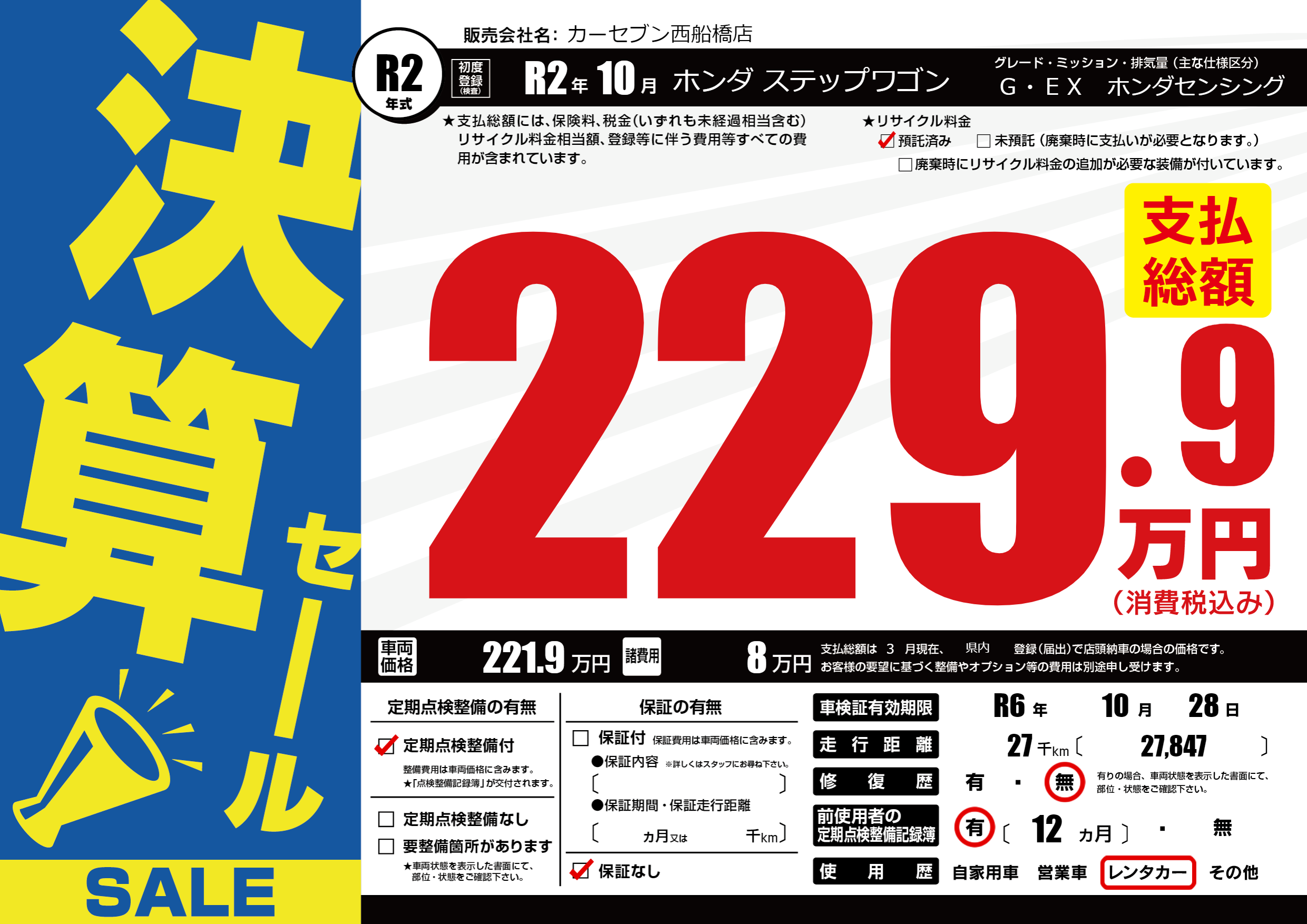 | 走行キロ | 2.7万km | 初年度登録 | R2年10月 |
