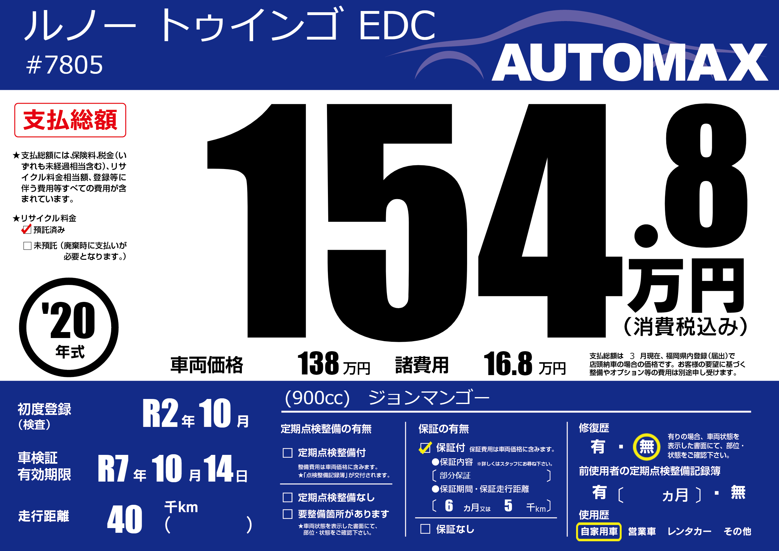 | 車名 | ルノー トゥインゴ EDC | グレード ミッション 排気量 |