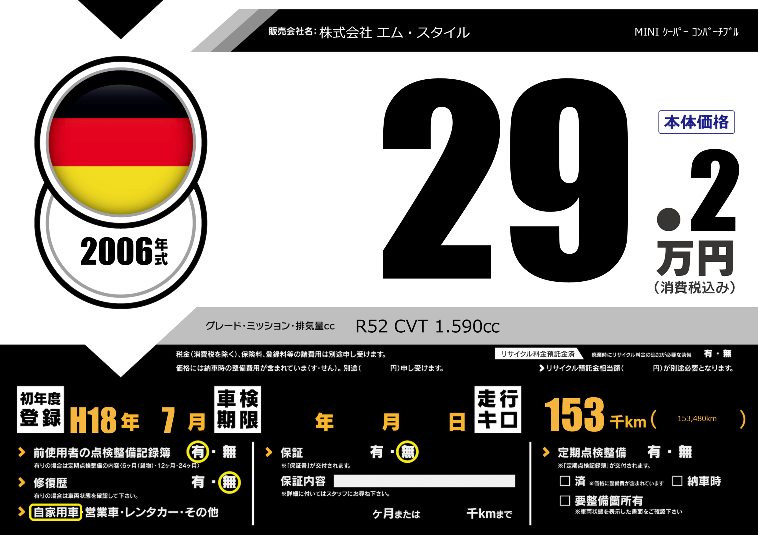 | 車名 | MINI クーパー コンバーチブル | グレード ミッション 排気量 |