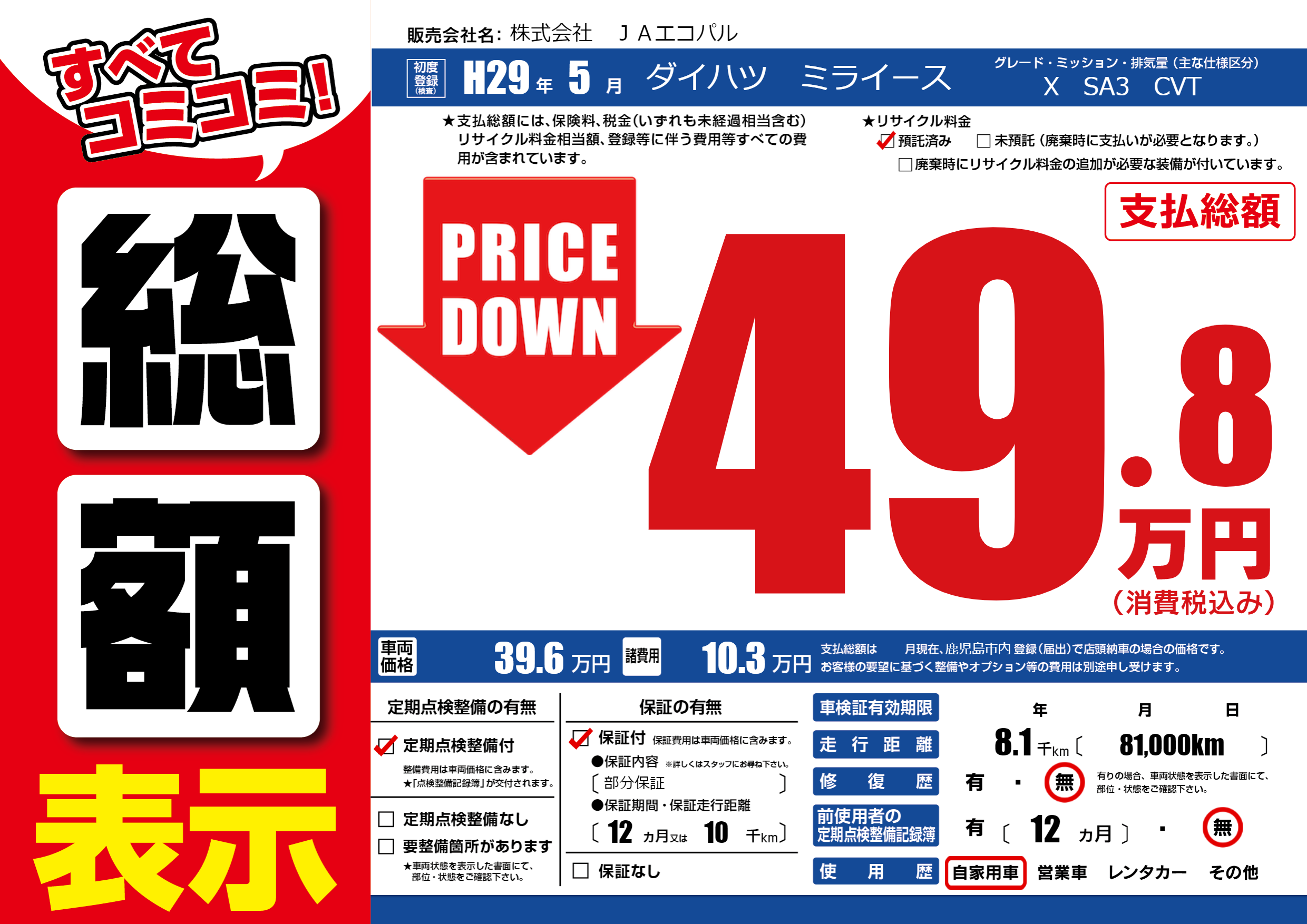 | 車名 | ダイハツ ミライース | グレード ミッション 排気量 |