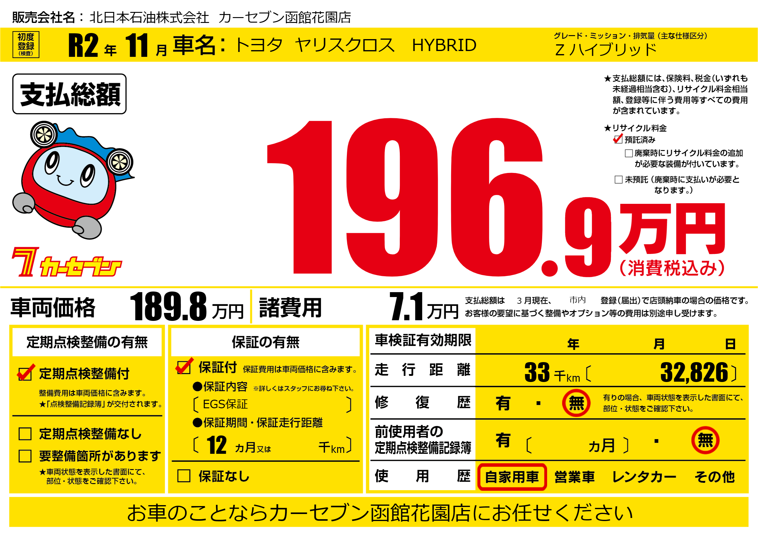 | 走行キロ | 3.3万km | 初年度登録 | R2年11月 |