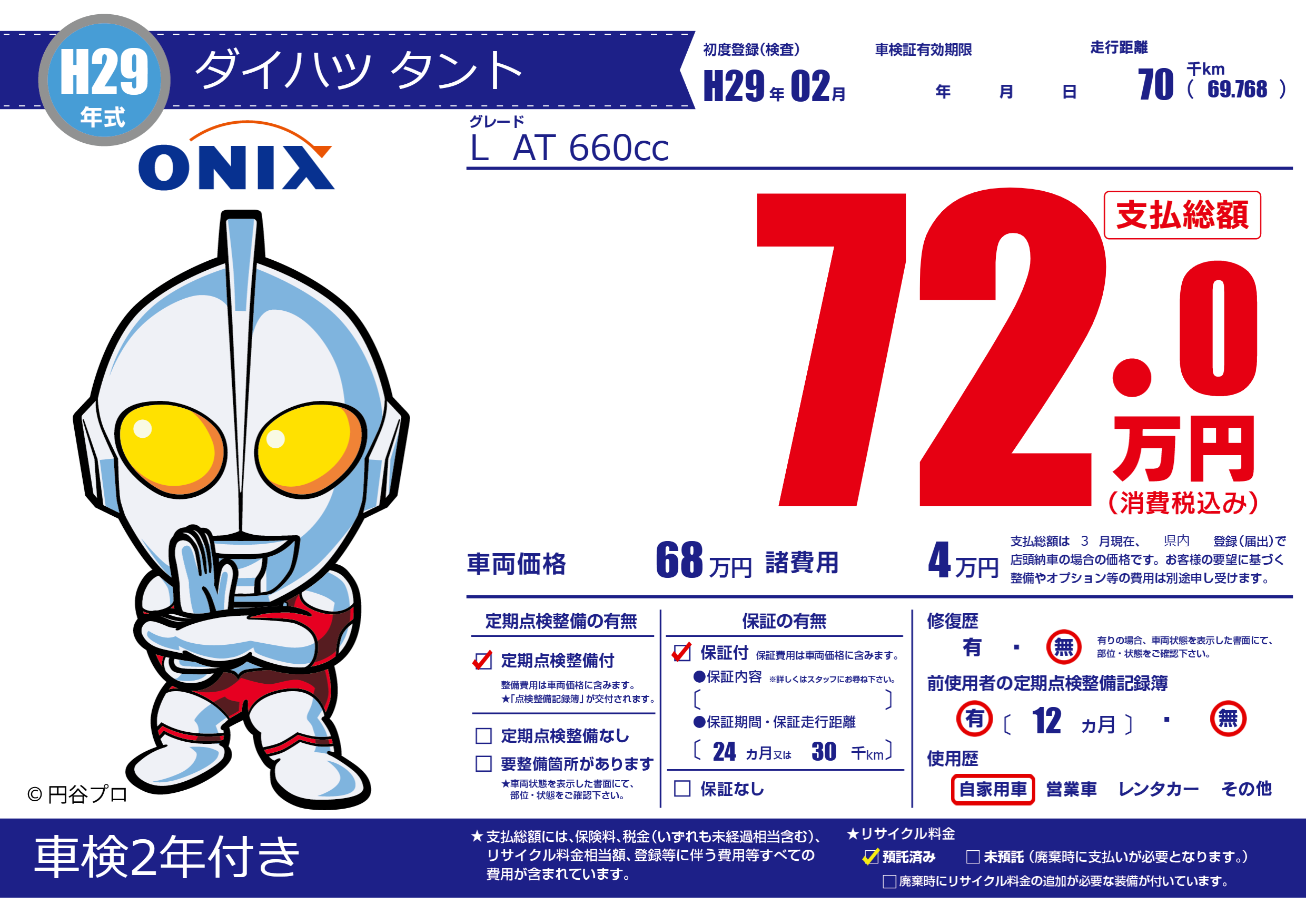 | 車名 | ダイハツ タント | グレード ミッション 排気量 |