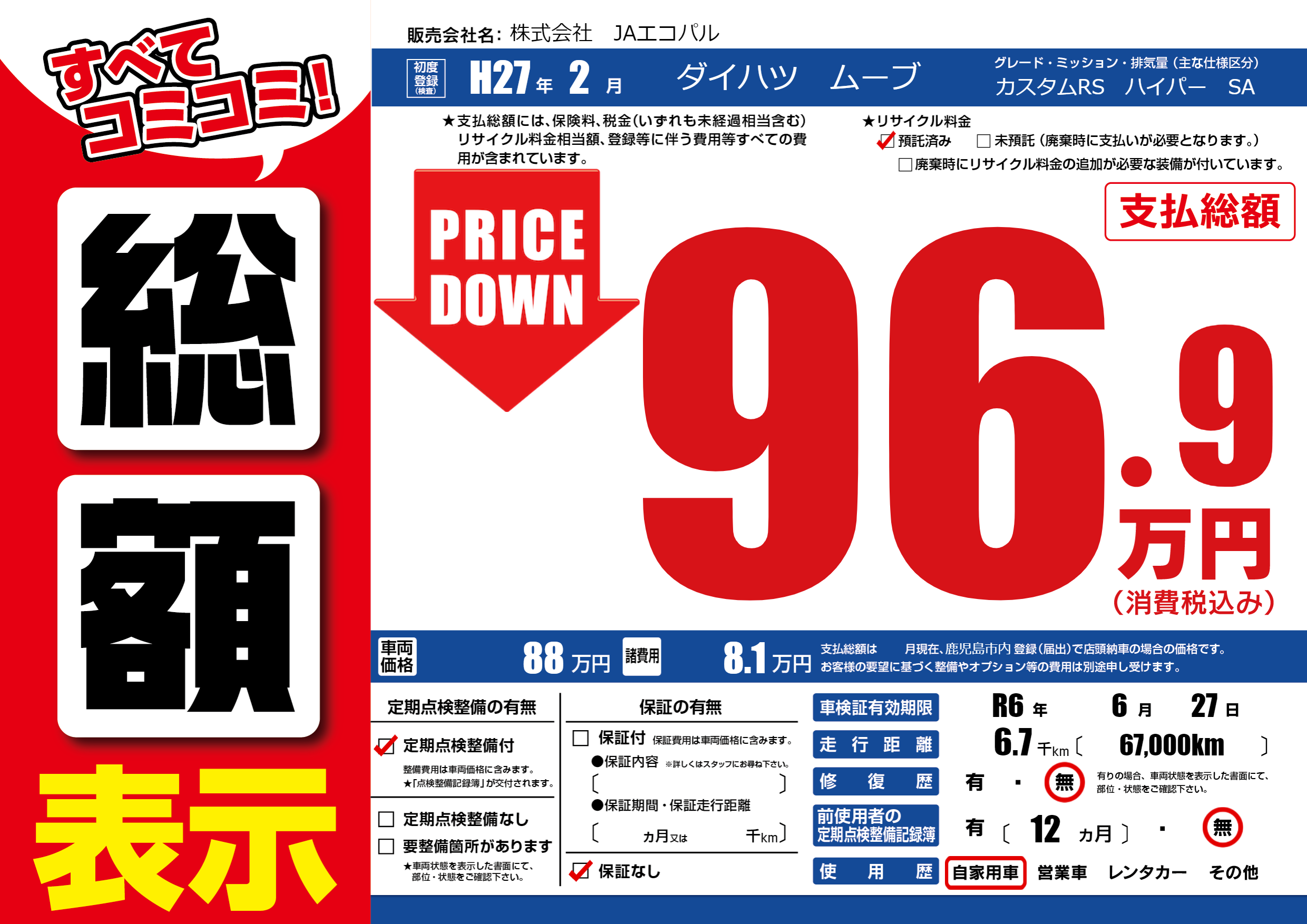 | 車検制限 | R6年 6月 27日 | ||