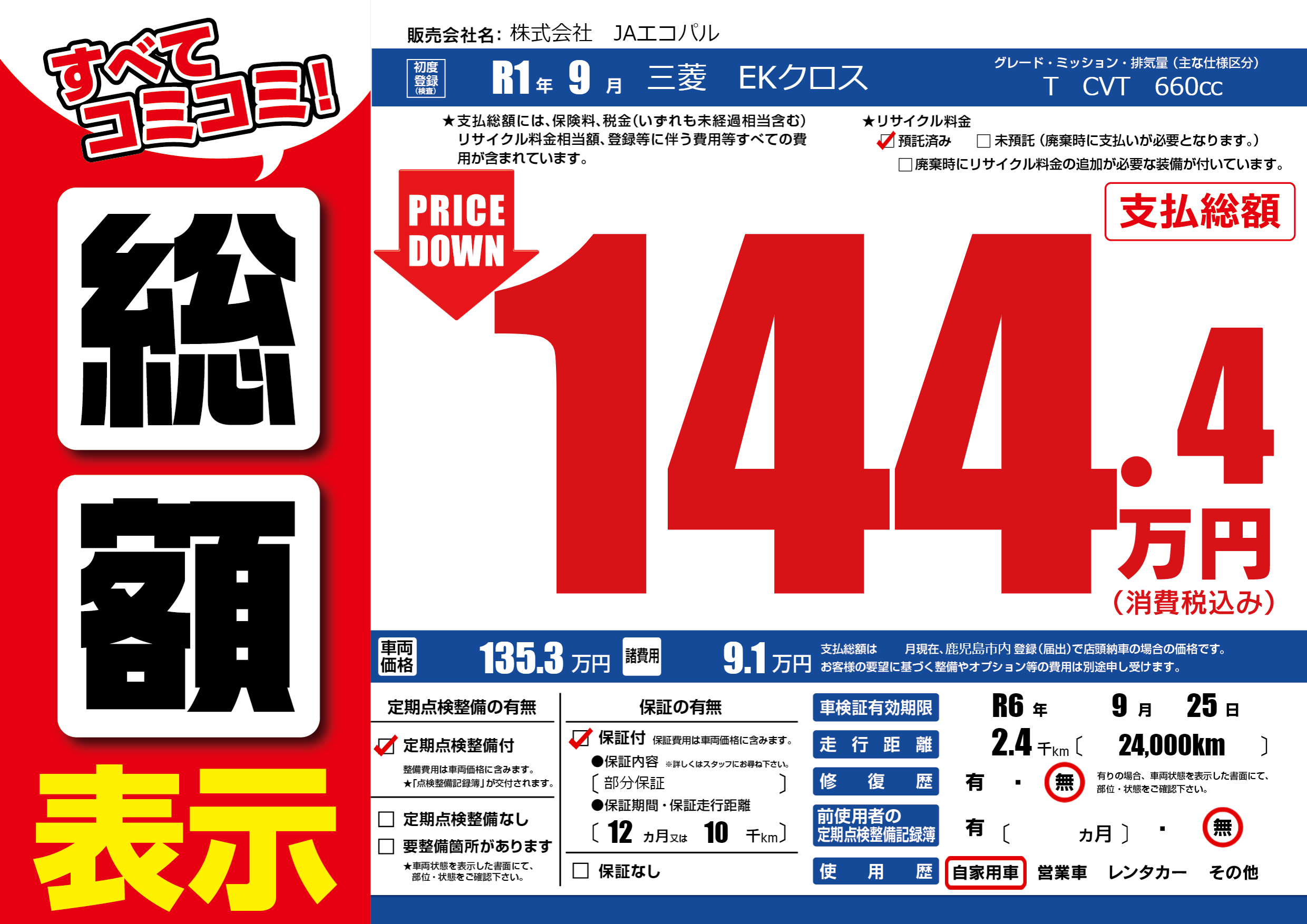 | 車名 | 三菱 EKクロス | グレード ミッション 排気量 |