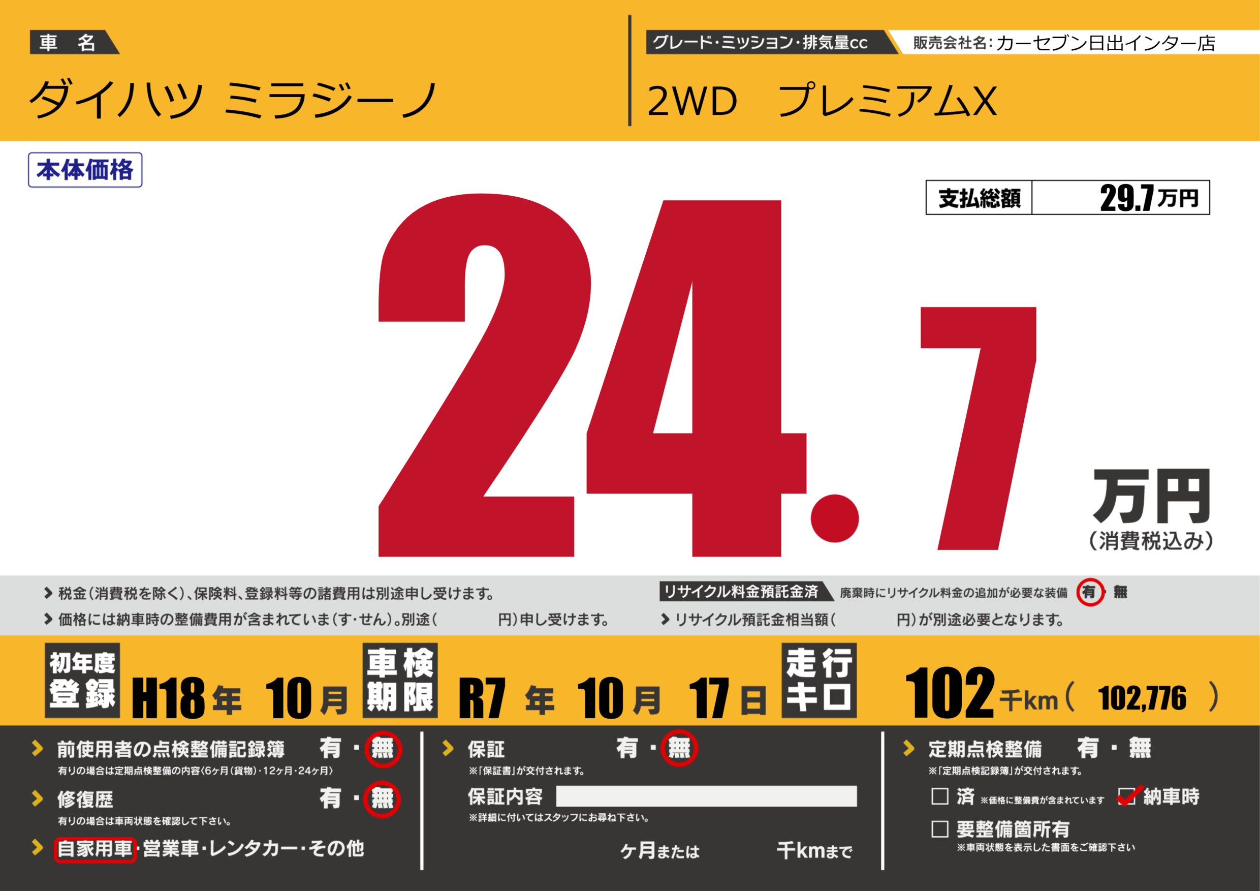 | 走行キロ | 10.2万km | 初年度登録 | H18年10月 |