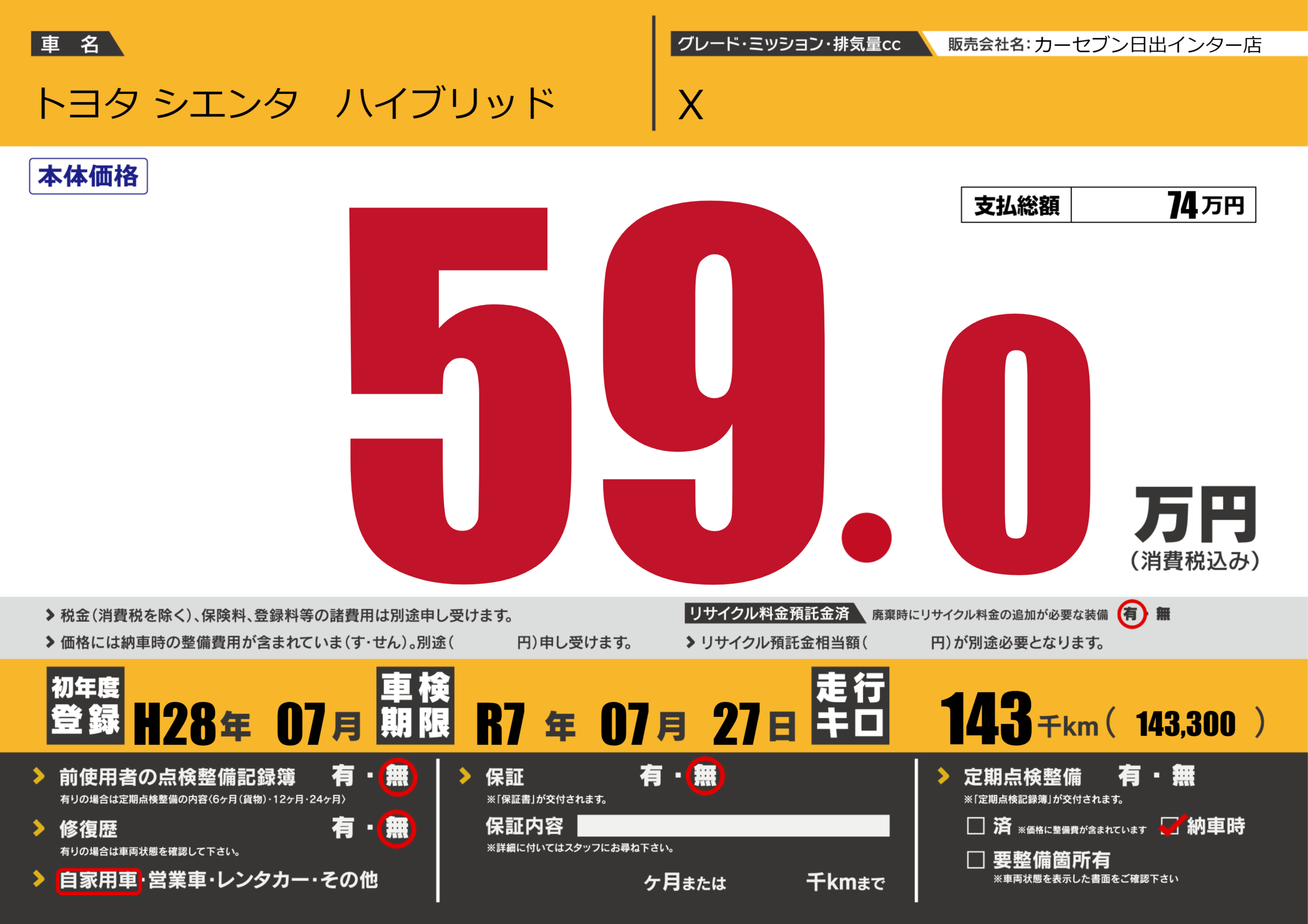 | 車名 | トヨタ シエンタ ハイブリッド | グレード ミッション 排気量 |