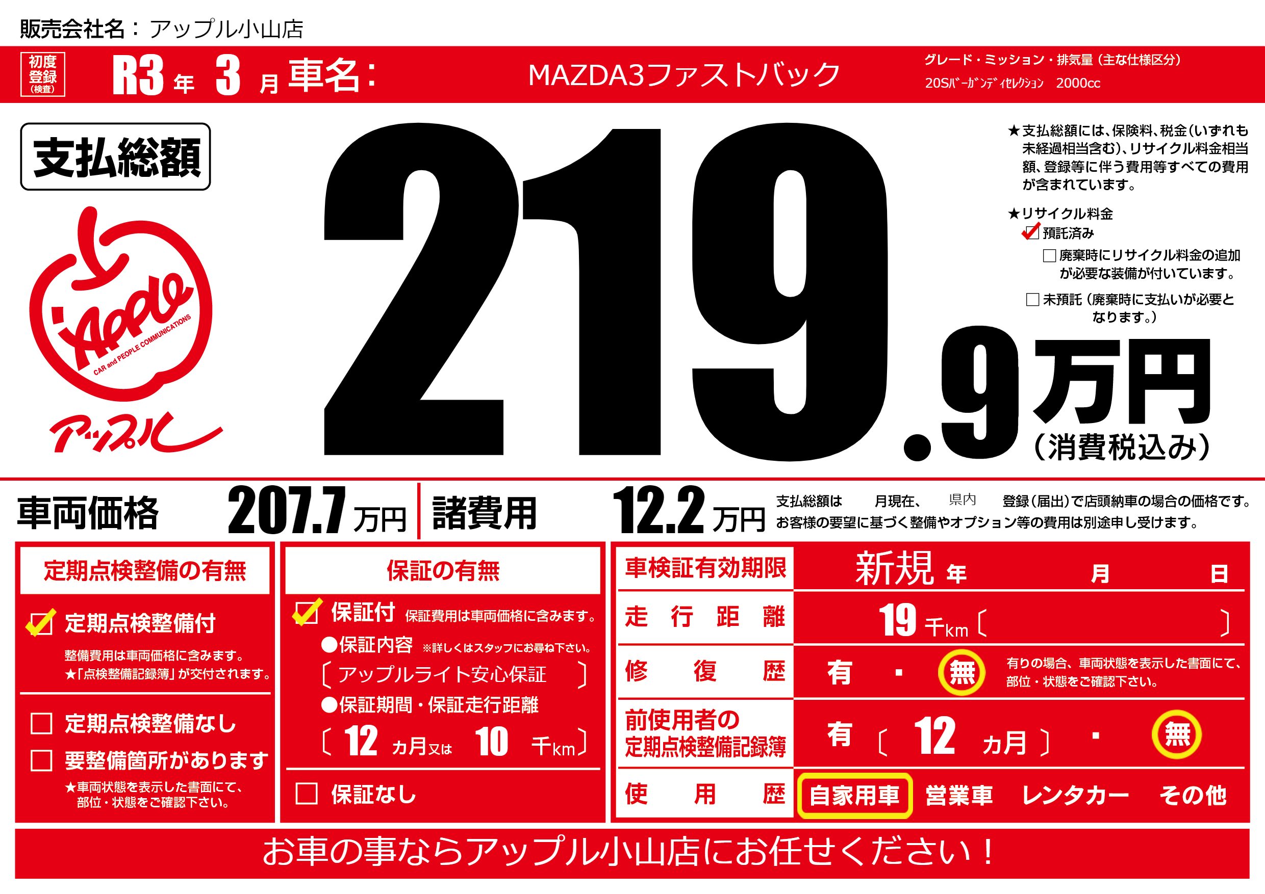 | 車名 | MAZDA3ファストバック | グレード ミッション 排気量 |