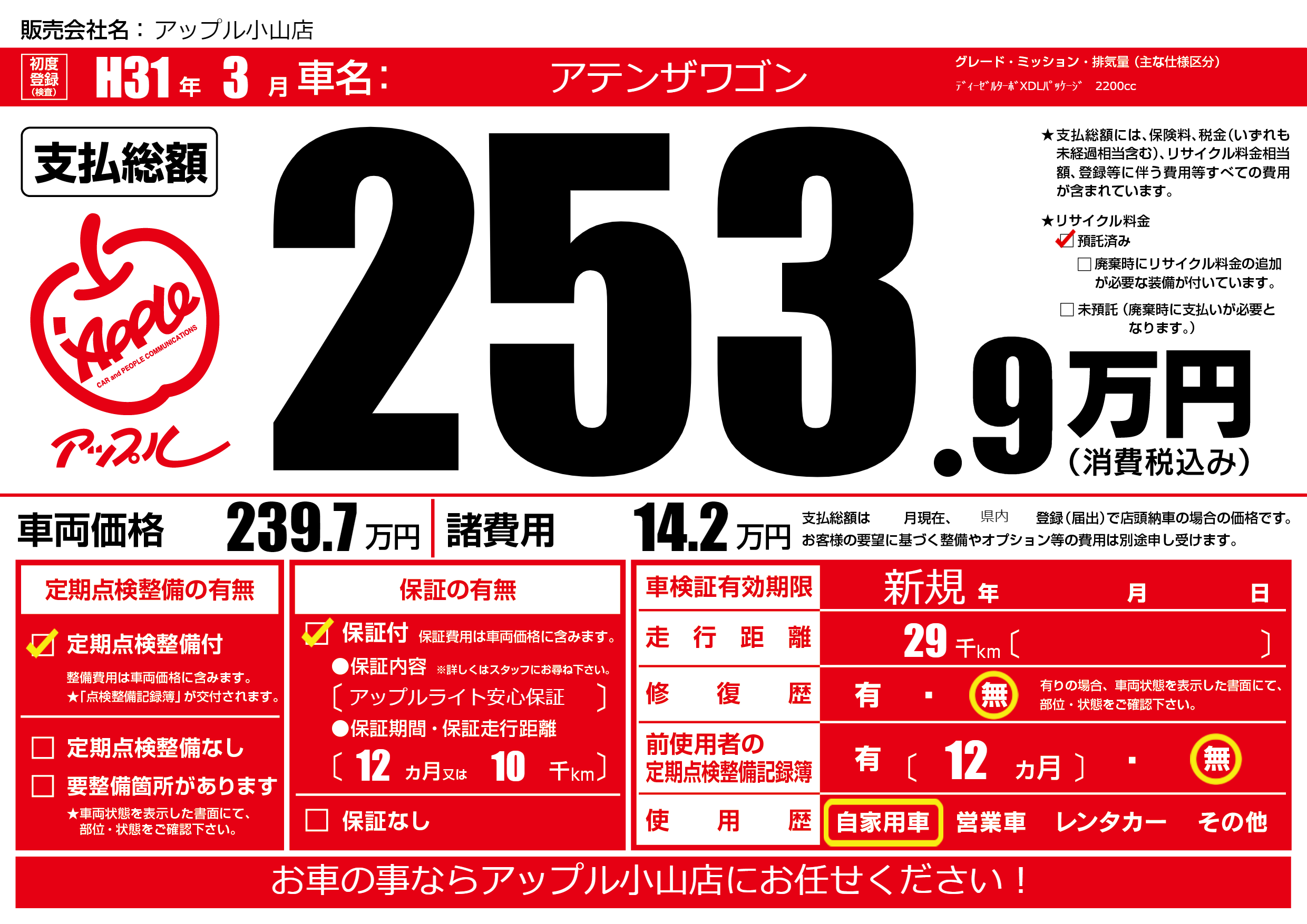 | 走行キロ | 2.9万km | 初年度登録 | H31年3月 |