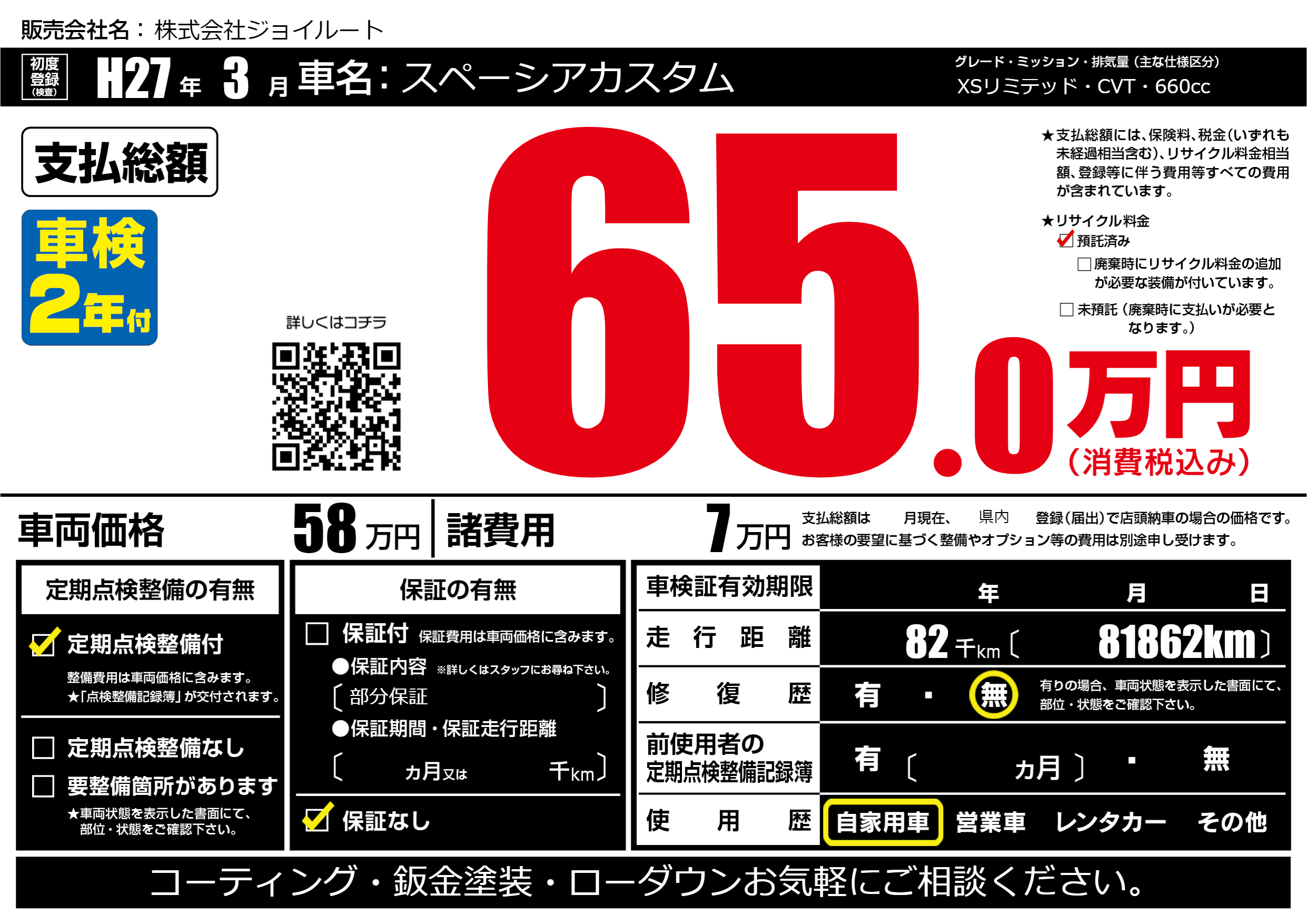 | 走行キロ | 8.2万km | 初年度登録 | H27年3月 |