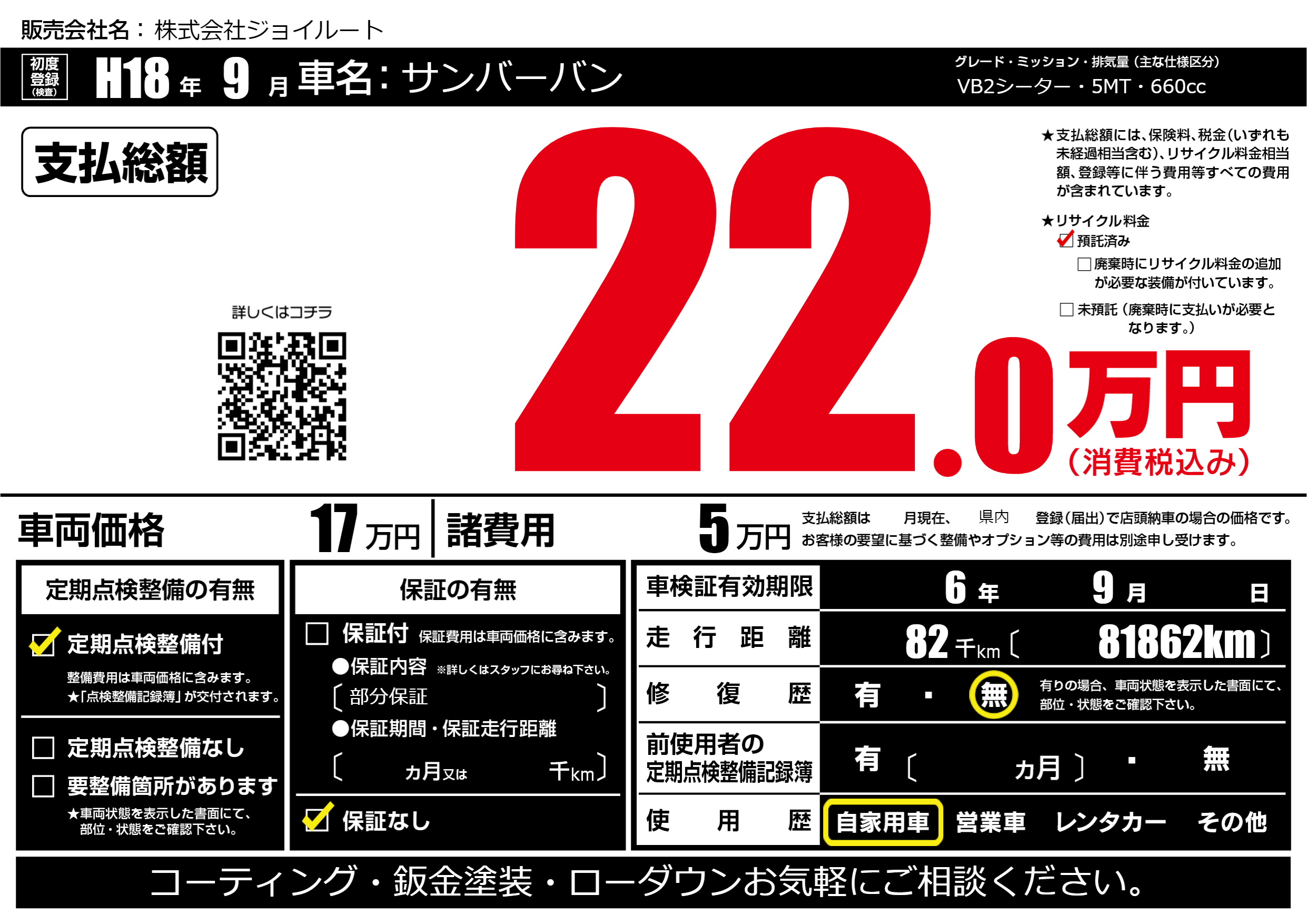 | 走行キロ | 8.2万km | 初年度登録 | H18年9月 |