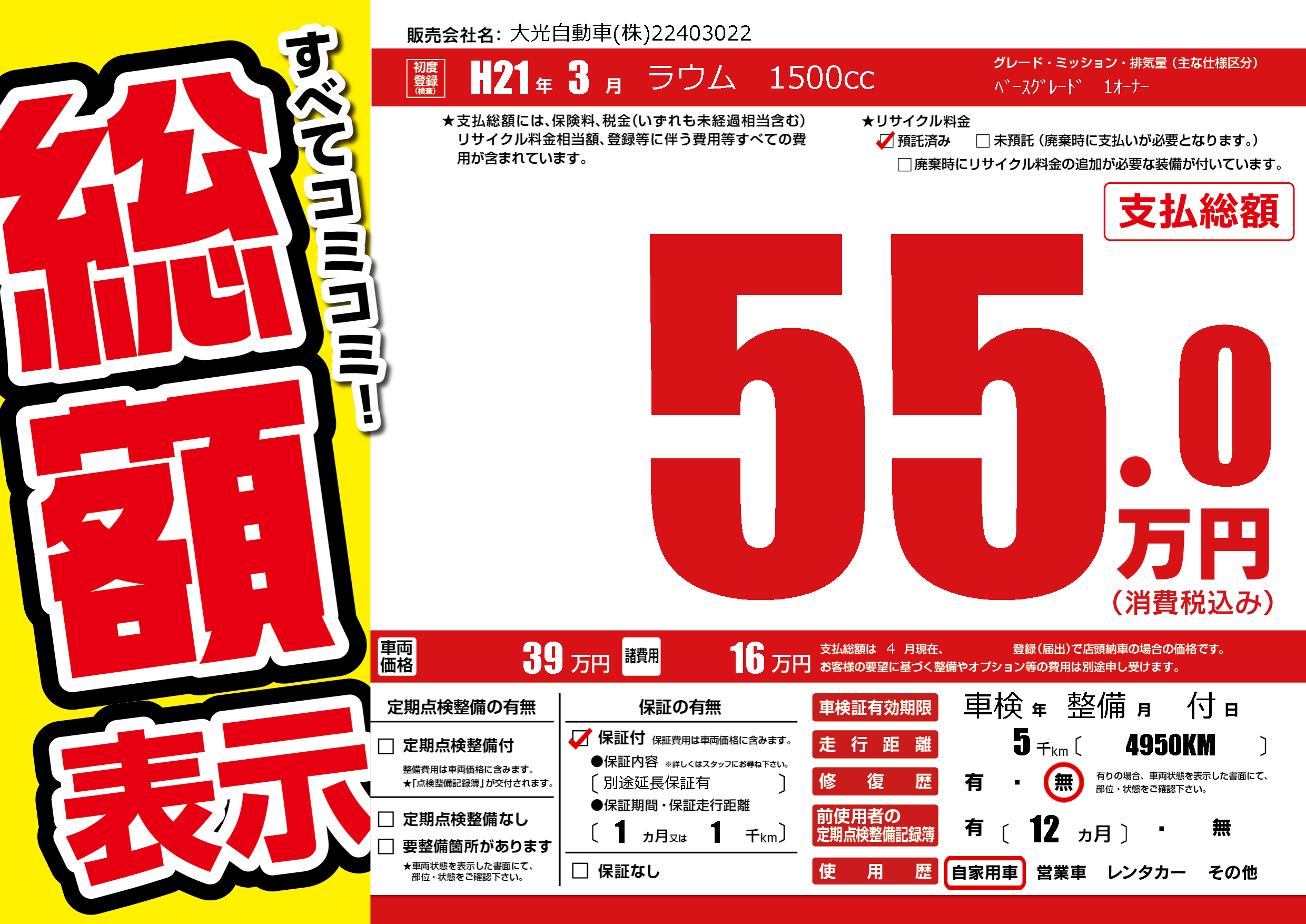 | 車名 | ラウム 1500cc | グレード ミッション 排気量 |