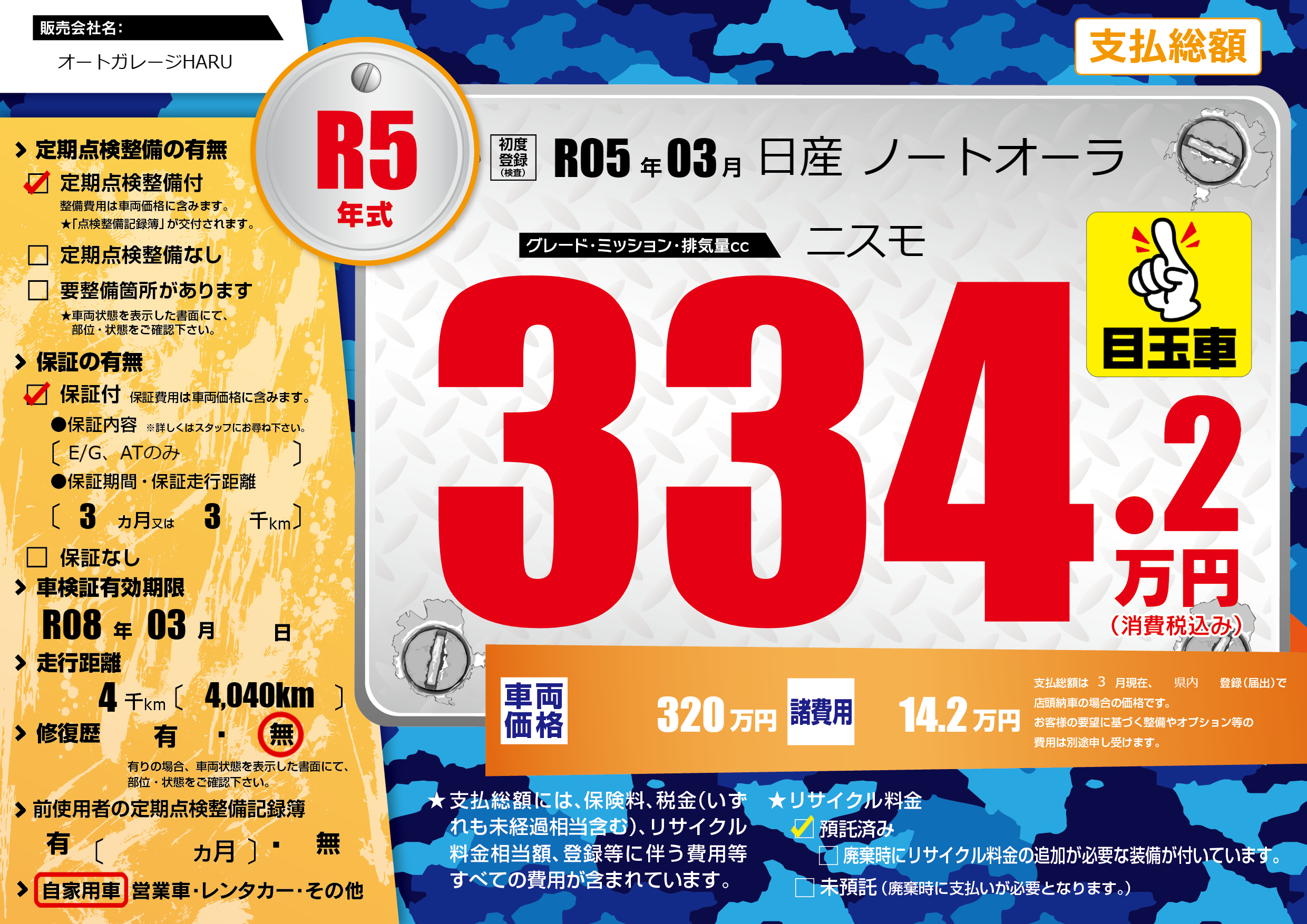 | 車名 | 日産 ノートオーラ | グレード ミッション 排気量 |