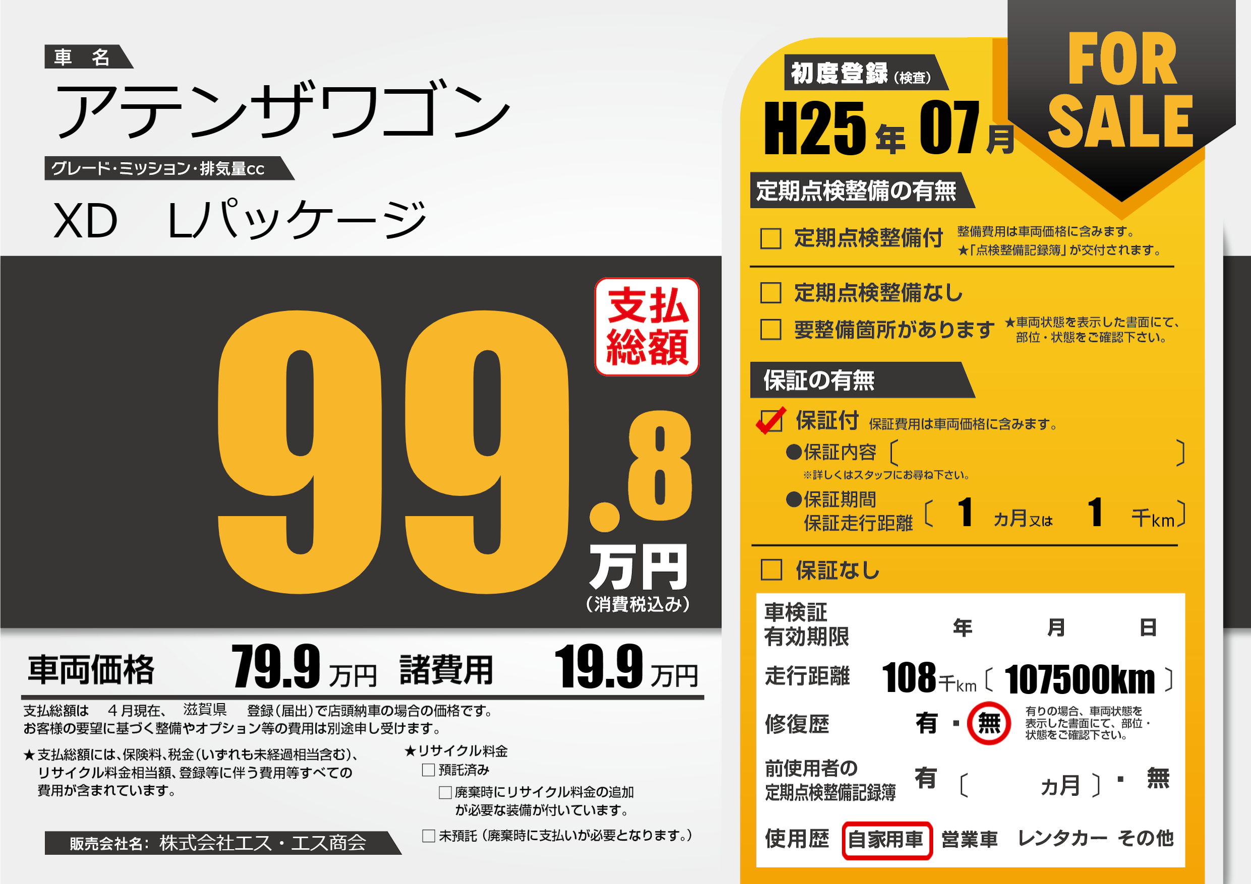 | 走行キロ | 10.8万km | 初年度登録 | H25年07月 |