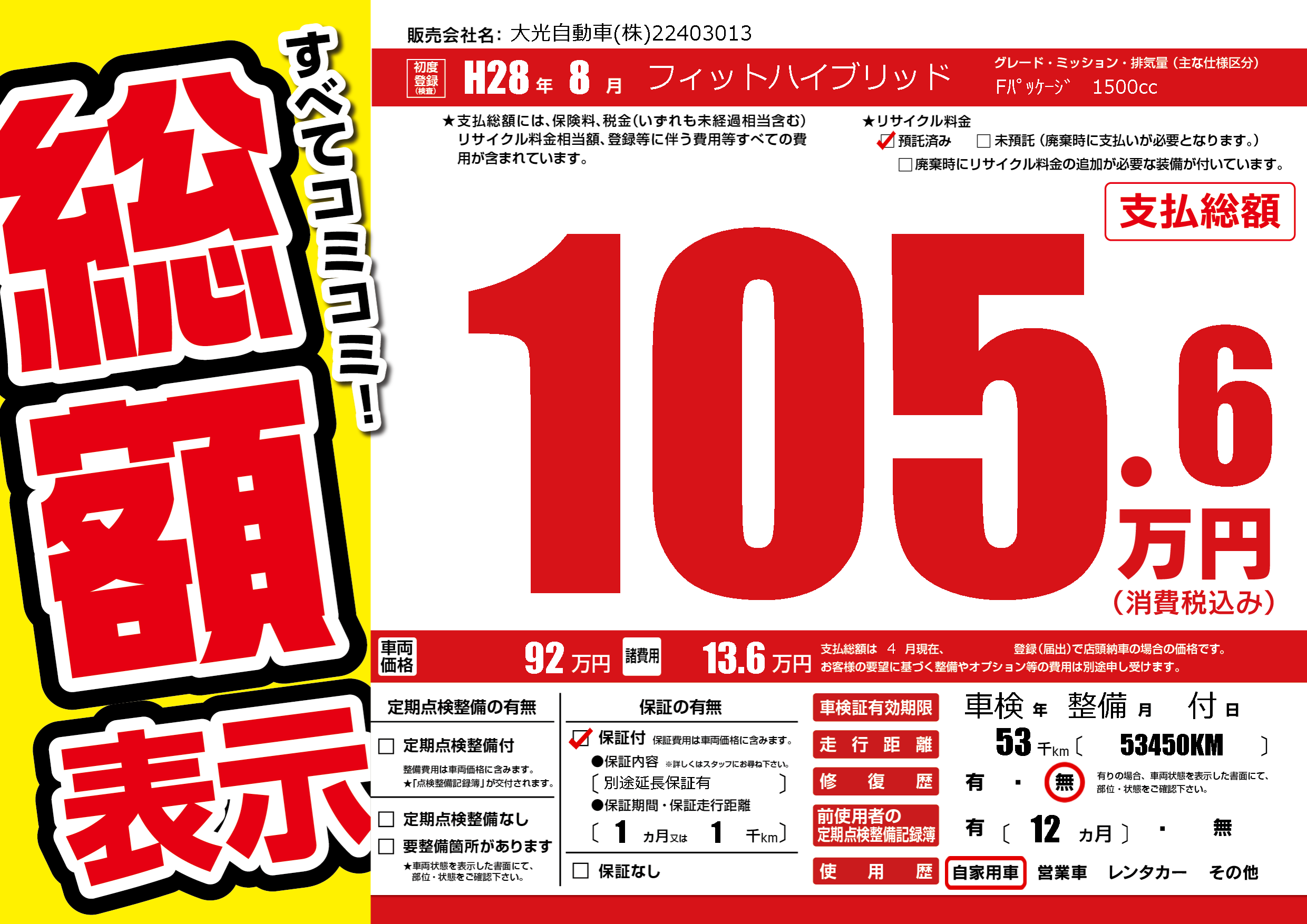 | 走行キロ | 5.3万km | 初年度登録 | H28年8月 |