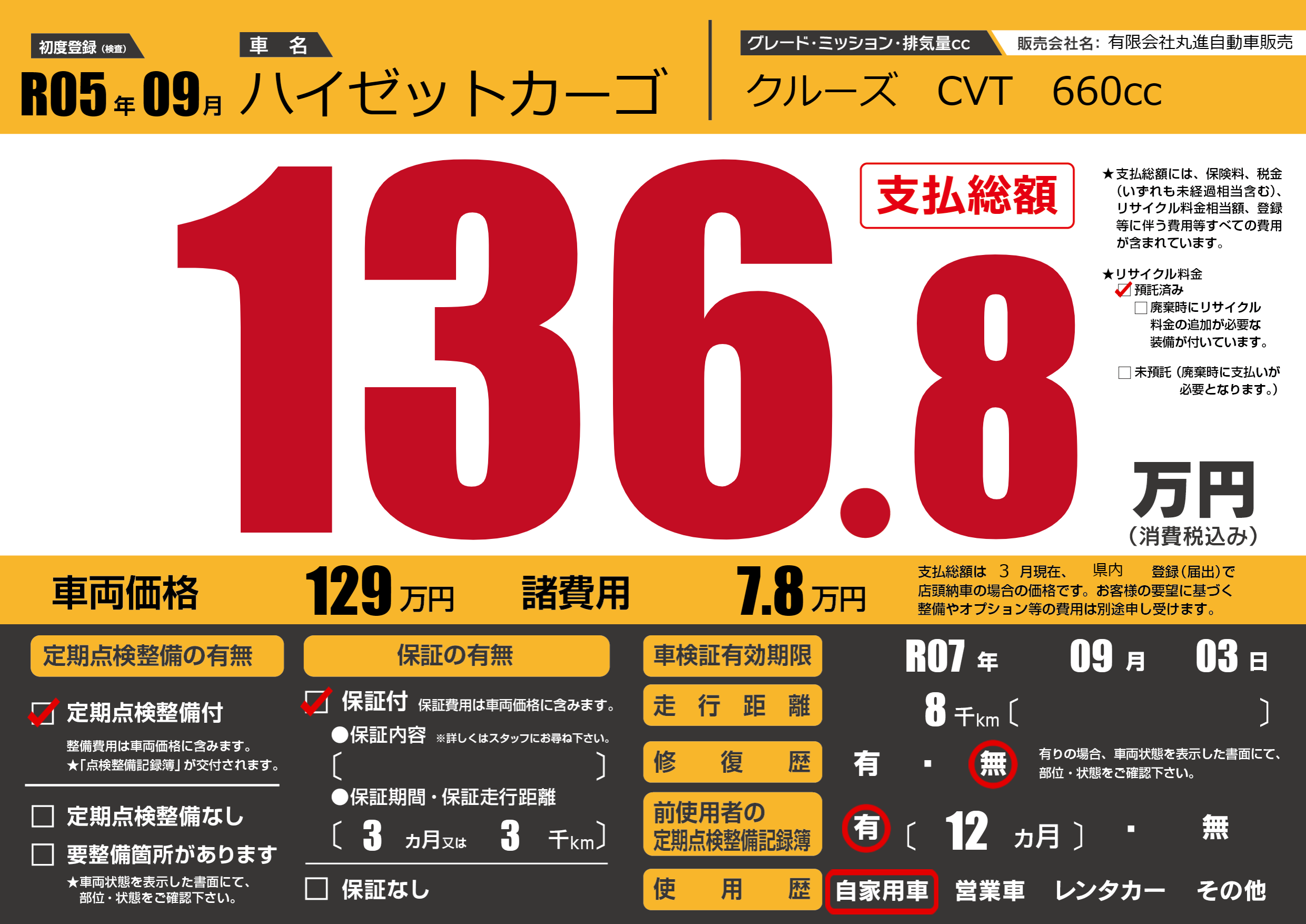 | 走行キロ | 0.8万km | 初年度登録 | R05年09月 |