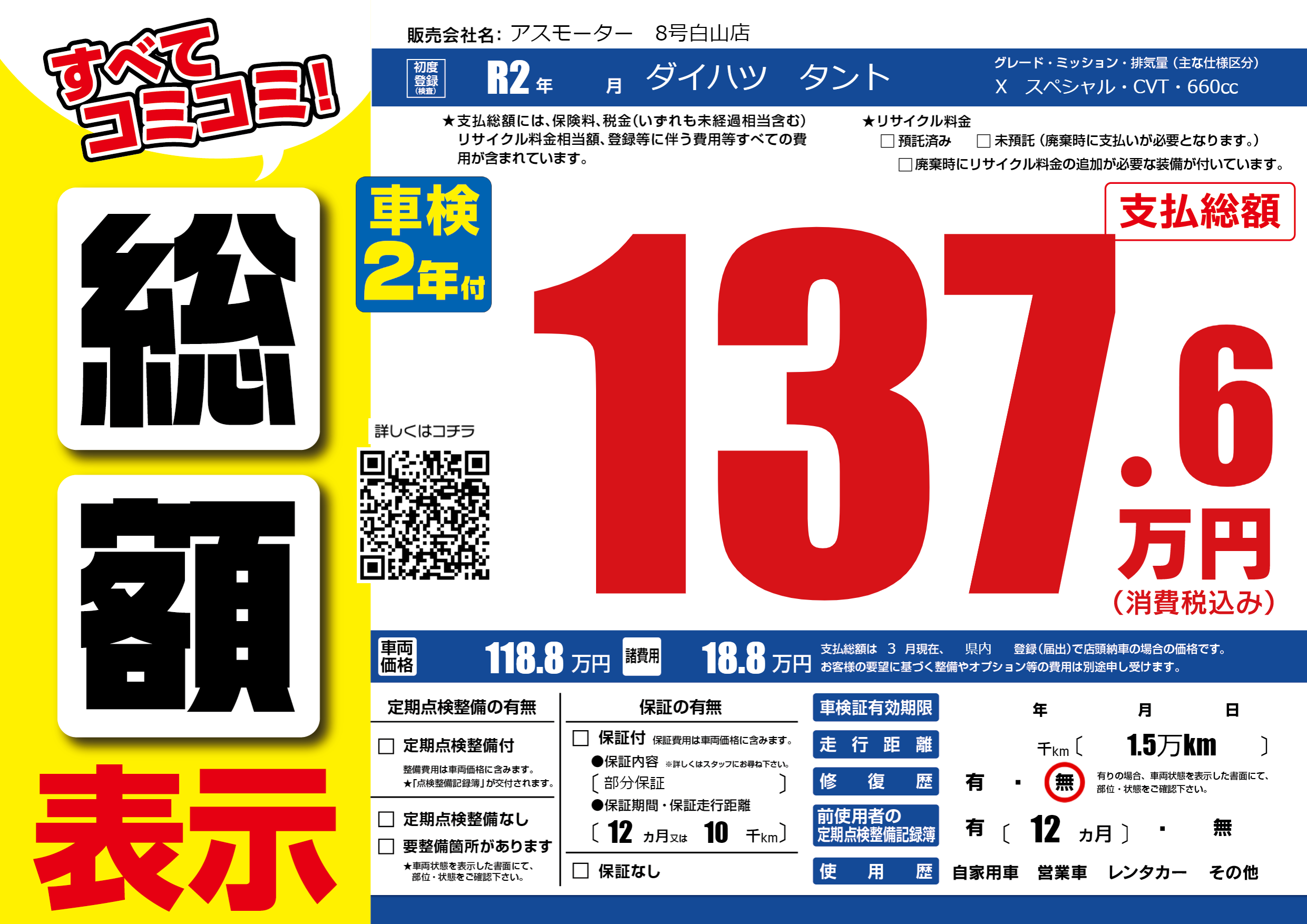 | 走行キロ | - | 初年度登録 | R2年---月 |