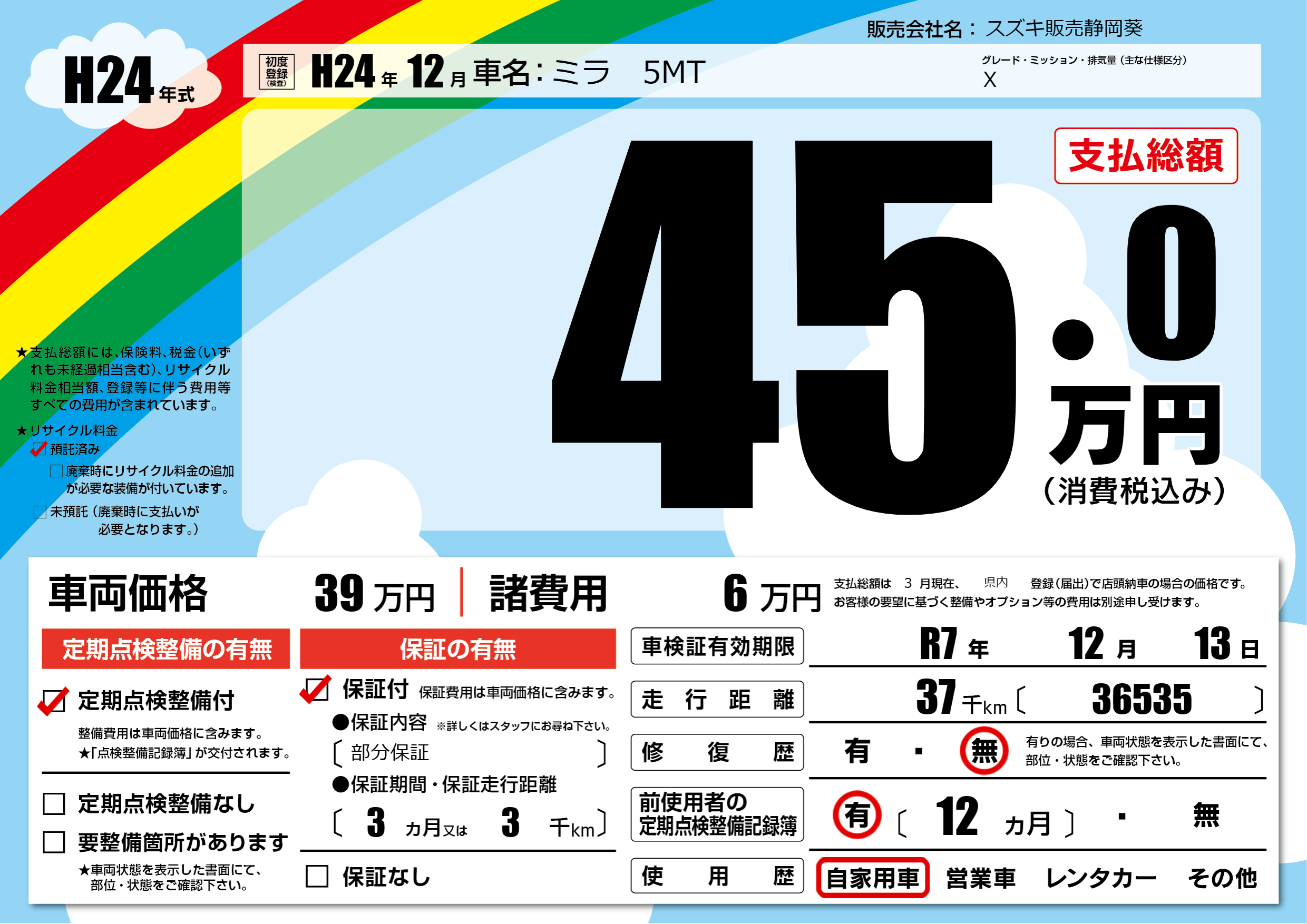 | 走行キロ | 3.7万km | 初年度登録 | H24年12月 |